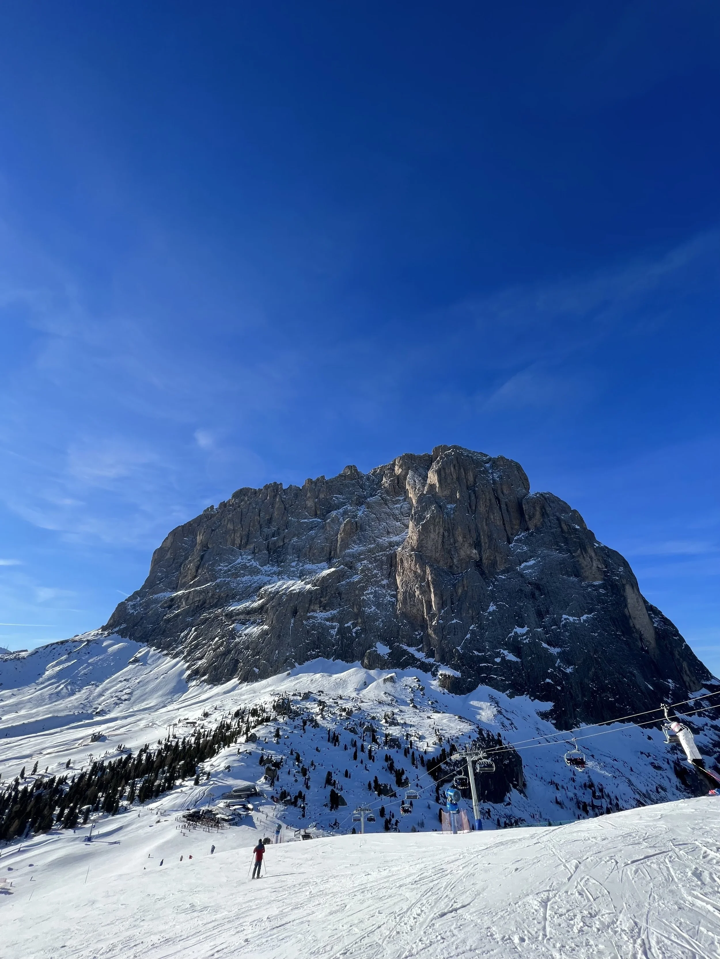 The majestic Dolomites. This is from one of our days skiing around the Sella Mountain, a famous day excursion when you ski trough over four different mountain passes which should not be missed.
