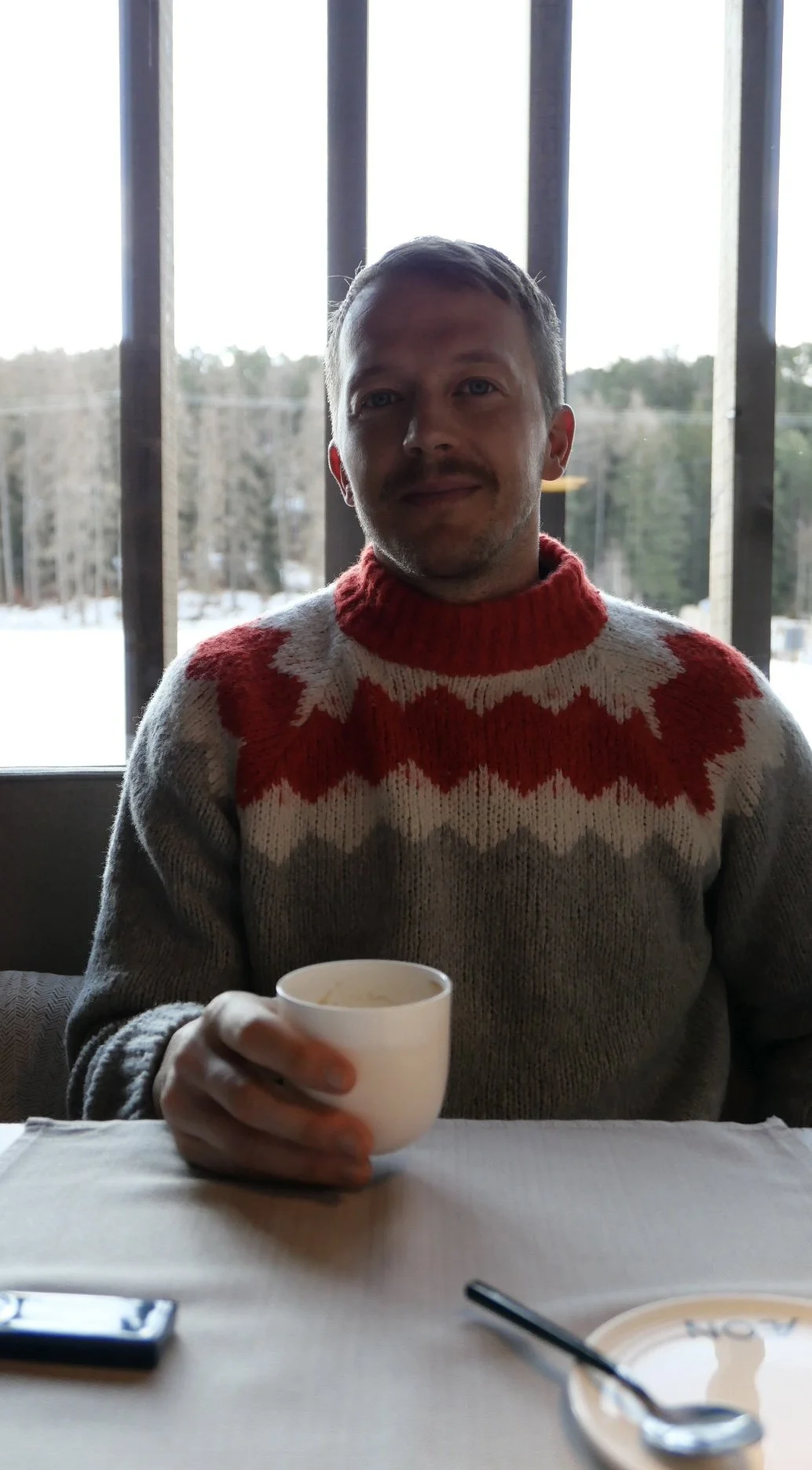 M enjoying a welcome drink. His drink of choice? Coffee.