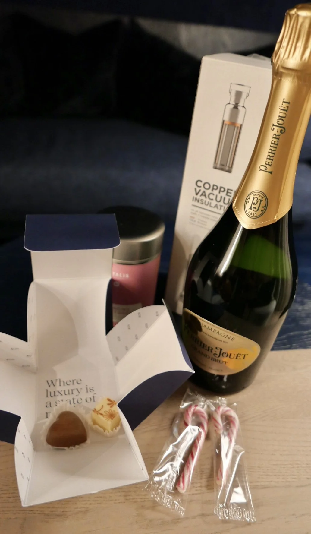 …was the in-room gift that was waiting for us when we arrived in our room. We are talking a bottle of champagne, artisanal chocolate, a thermos, tea and a scented candle.