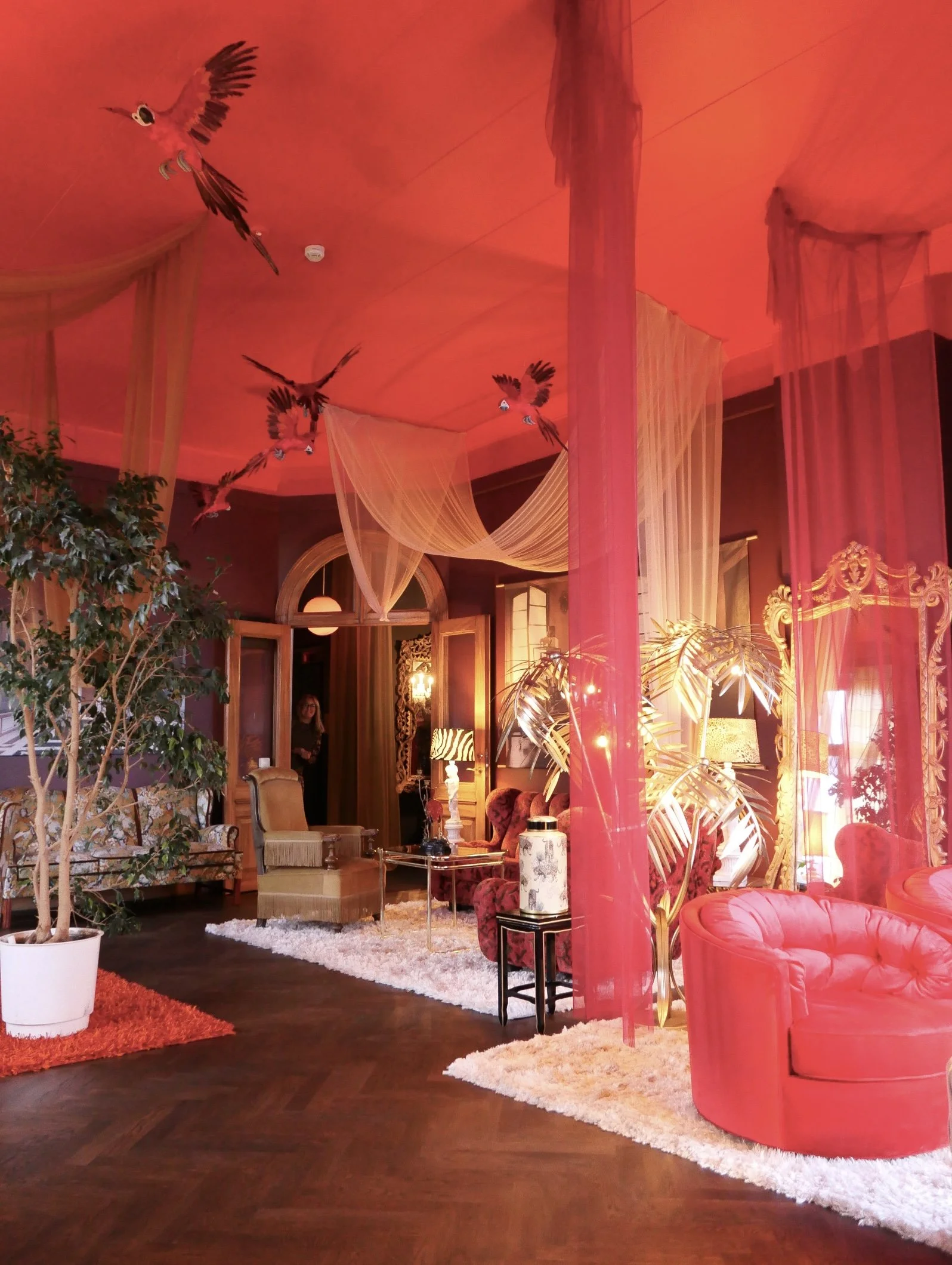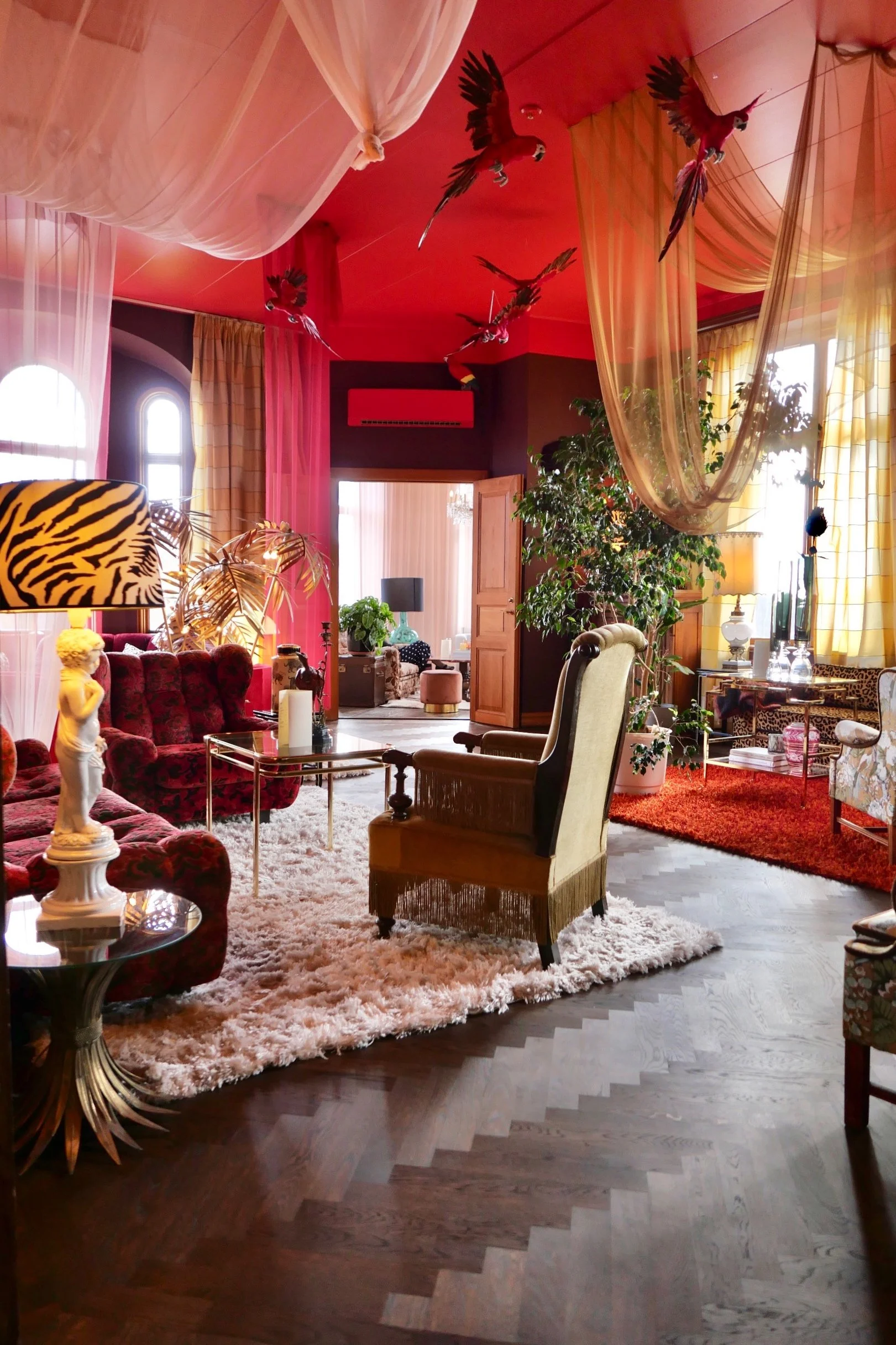 It is drink o’clock! The bar is located on the first floor and it looks like this! Maximalism extravaganza. I mean, just look at the parrots hanging from the ceiling.