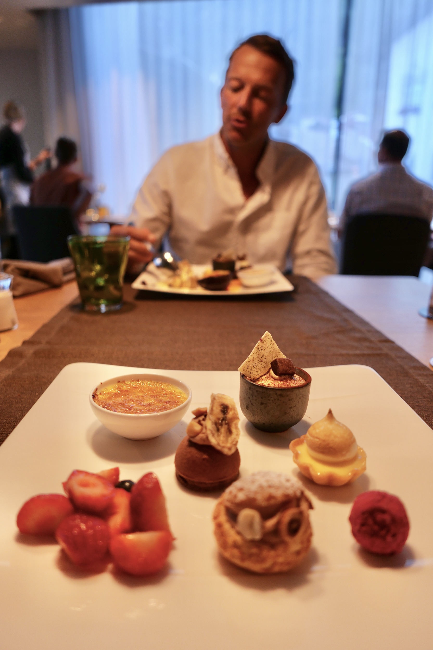 For us it was too hot to sit outside so we ate inside. M enjoying his selection from the desert buffet. The winner for me? The tiny lemon merengue pastry.
