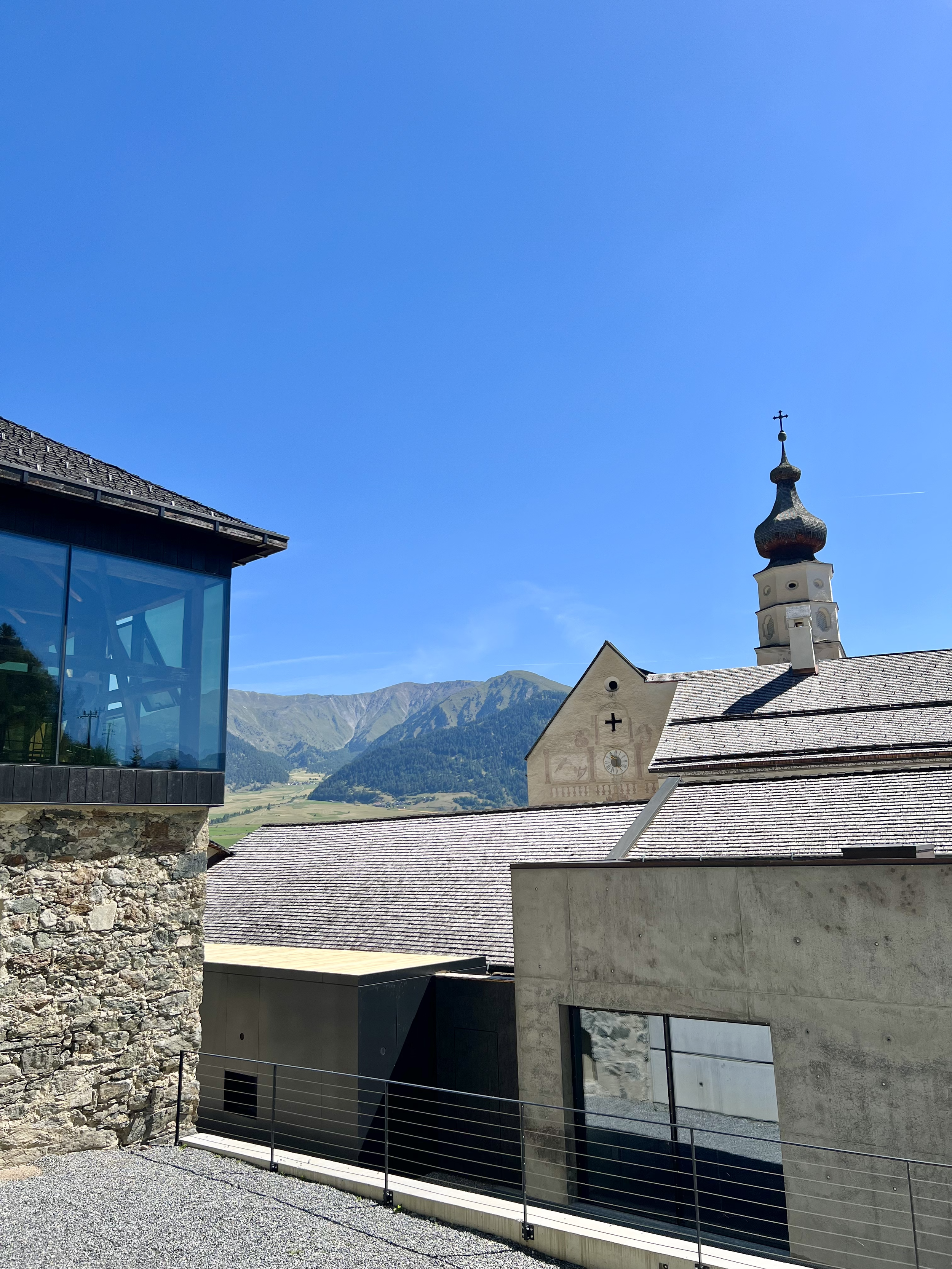 In the small, unassuming village of Burgusio (or Burgeis in German, since this part of Italy is bilingual), there is a hotel that is everything but unassuming. It is called Weisses Kreuz and is one of those classic Alpine hotels that has undergone a kind of metamorphosis where some contemporary design elements have been added, both on the inside and the outside. It find it so fascinating to see how these traditionally designed buildings work so well with modern architectural structures. There is a cyclical movement that I truly appreciate.