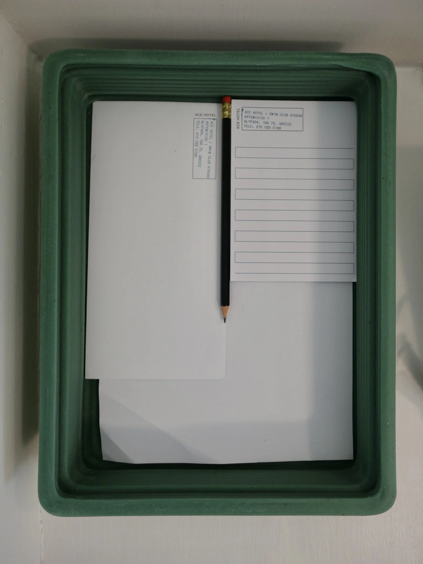 All other Ace hotels I have stayed at, there has been a turn table in the room. But not here. In Athens there is a guitar so you can make your own music.