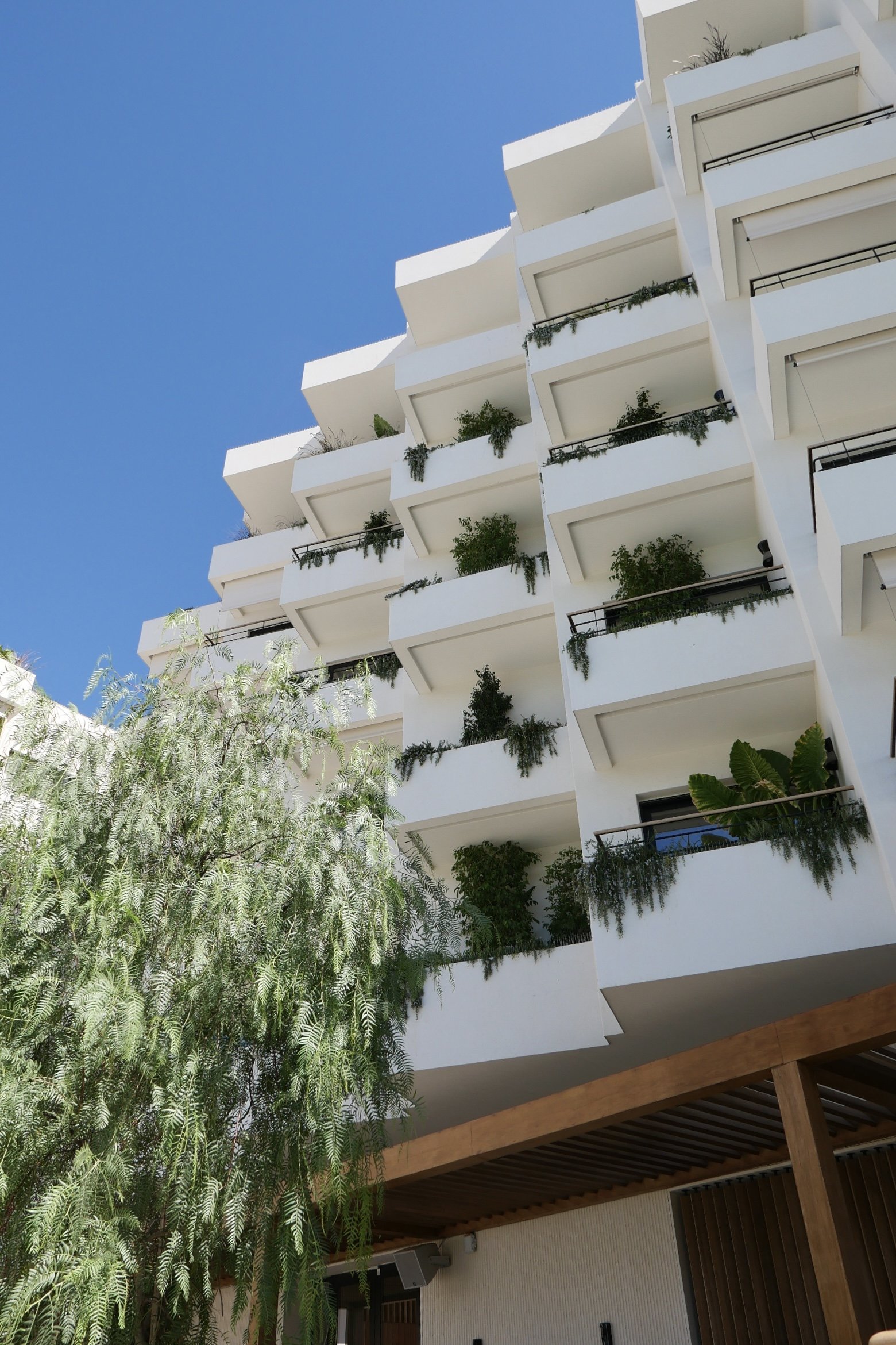 The outside has a geometric, brutalist look all in white with huge Hockney-inspired murals. Another stand out are the cubist, plant-adorned balconies making celebrating the classic seaside hotels from last century.
