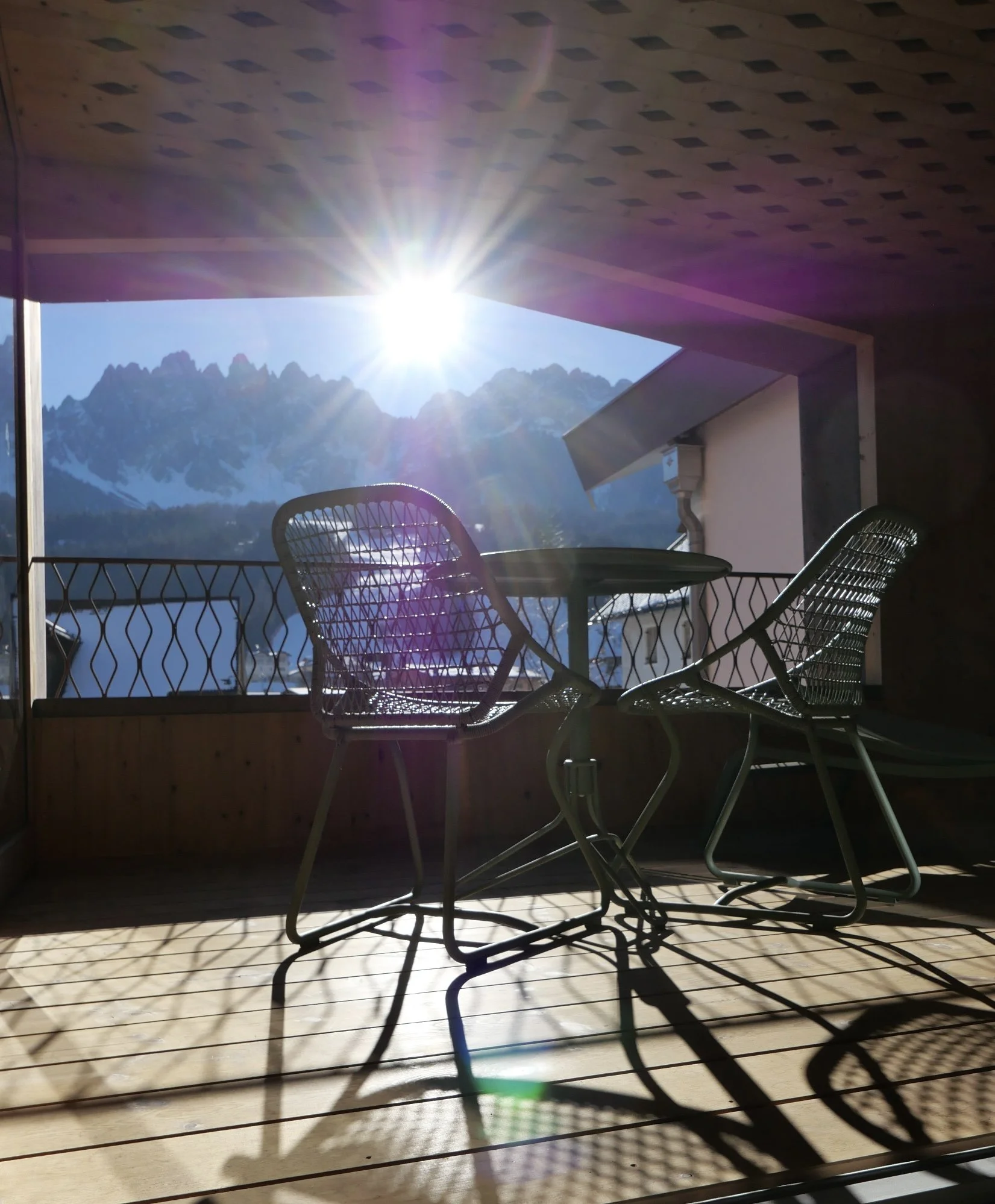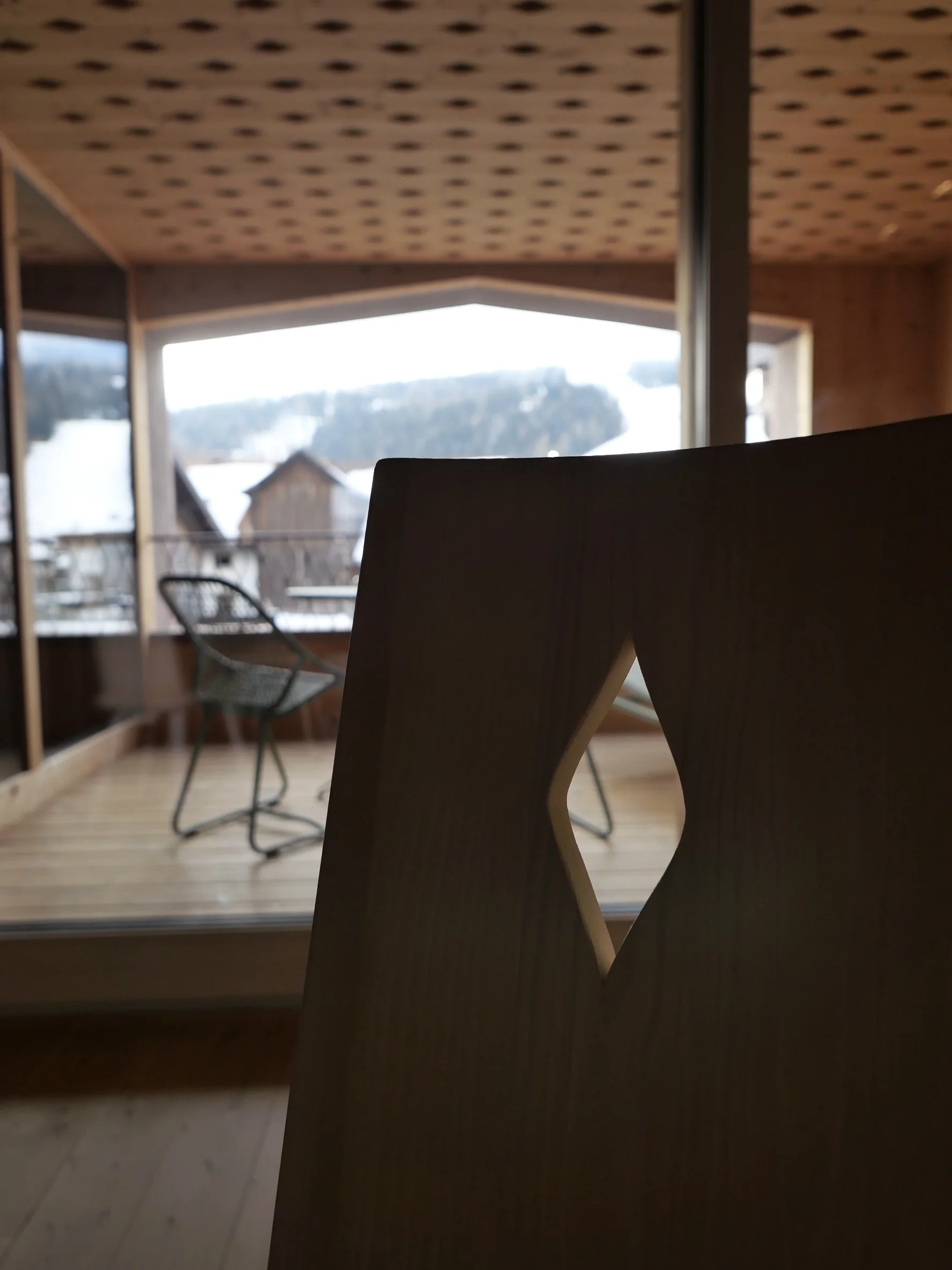 My favorite space was for sure the balcony. Or to be honest, it was not really a balcony since it was built into the building. However, this outdoor space was so beautifully done with hand made carvings in the wooden ceiling and the most beautiful view of the mountains. I loved to bring the extra fluffy duvets (and a glass of wine) out with me and create a cocoon in the sun bed. To lay there trying to shield myself from the cold mountain air as the day drew to an end, watching the dramatic mountain range change character and color in tune with the setting sun. Pure mountain magic!
