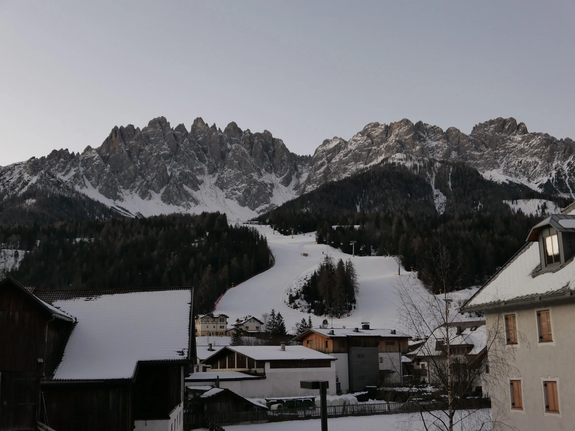 …is the view. The hotel is standing right in front of a dramatic section of the Dolomites, the Haunold Mountains. So to sit on your balcony in the evening when it looks like the last rays of sun is setting the mountains on fire is simply breath taking.