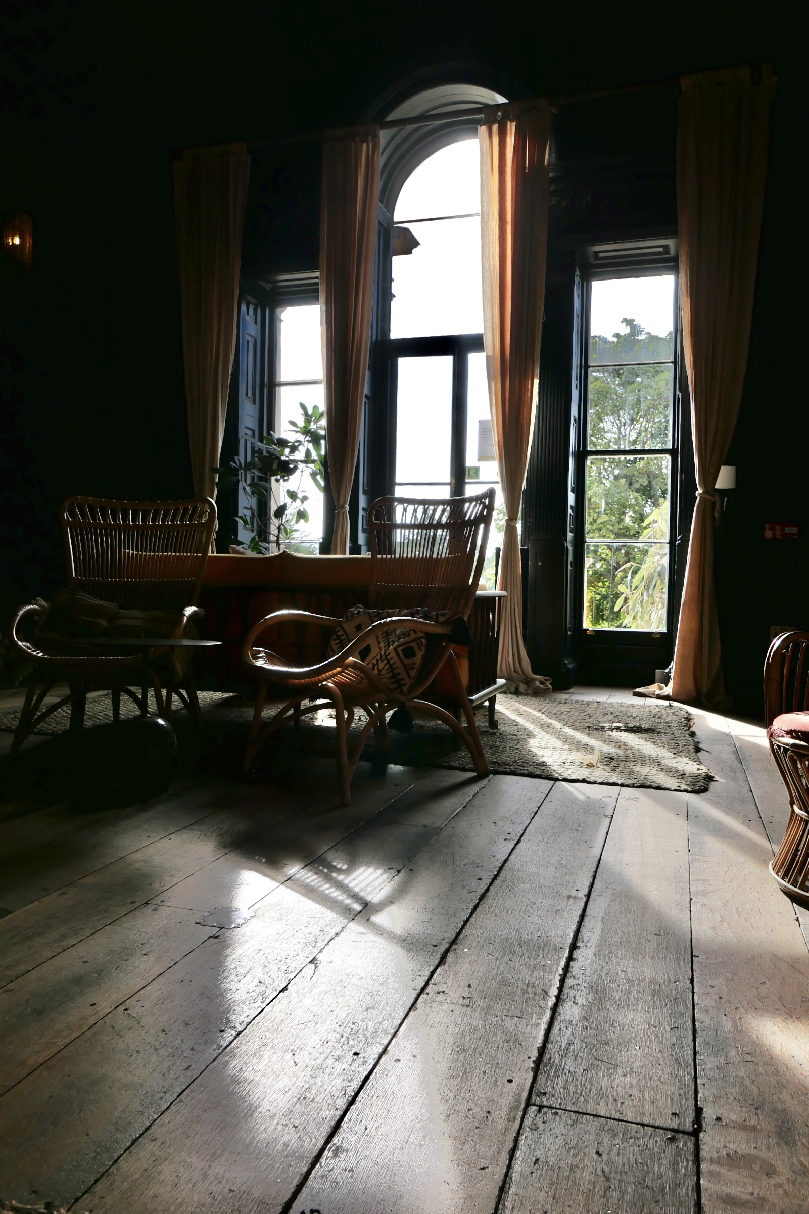 Everywhere you turn there are these interesting rooms/spaces. Like this sitting room with rattan furniture, original wooden floors and heavy mustard colored drapes.