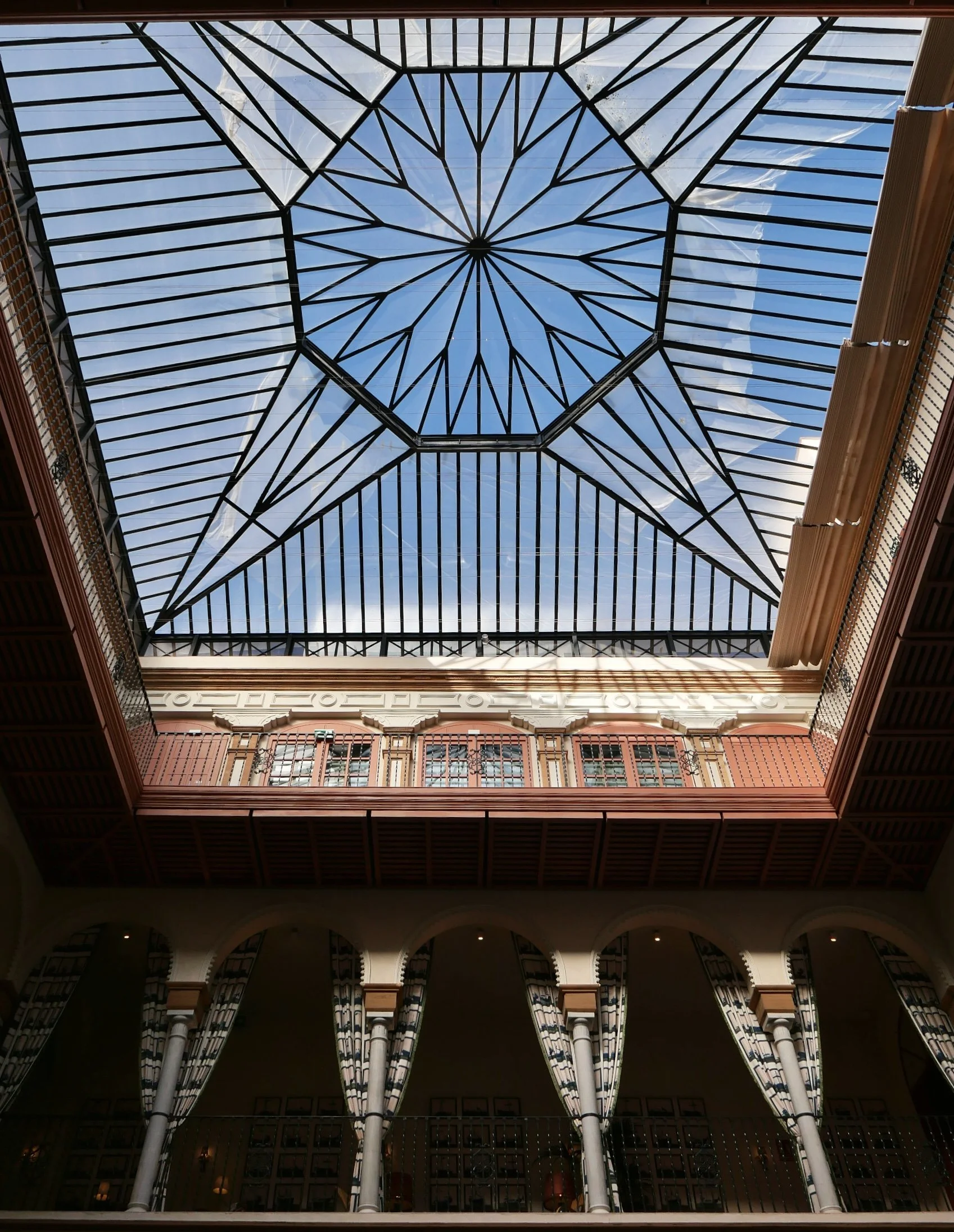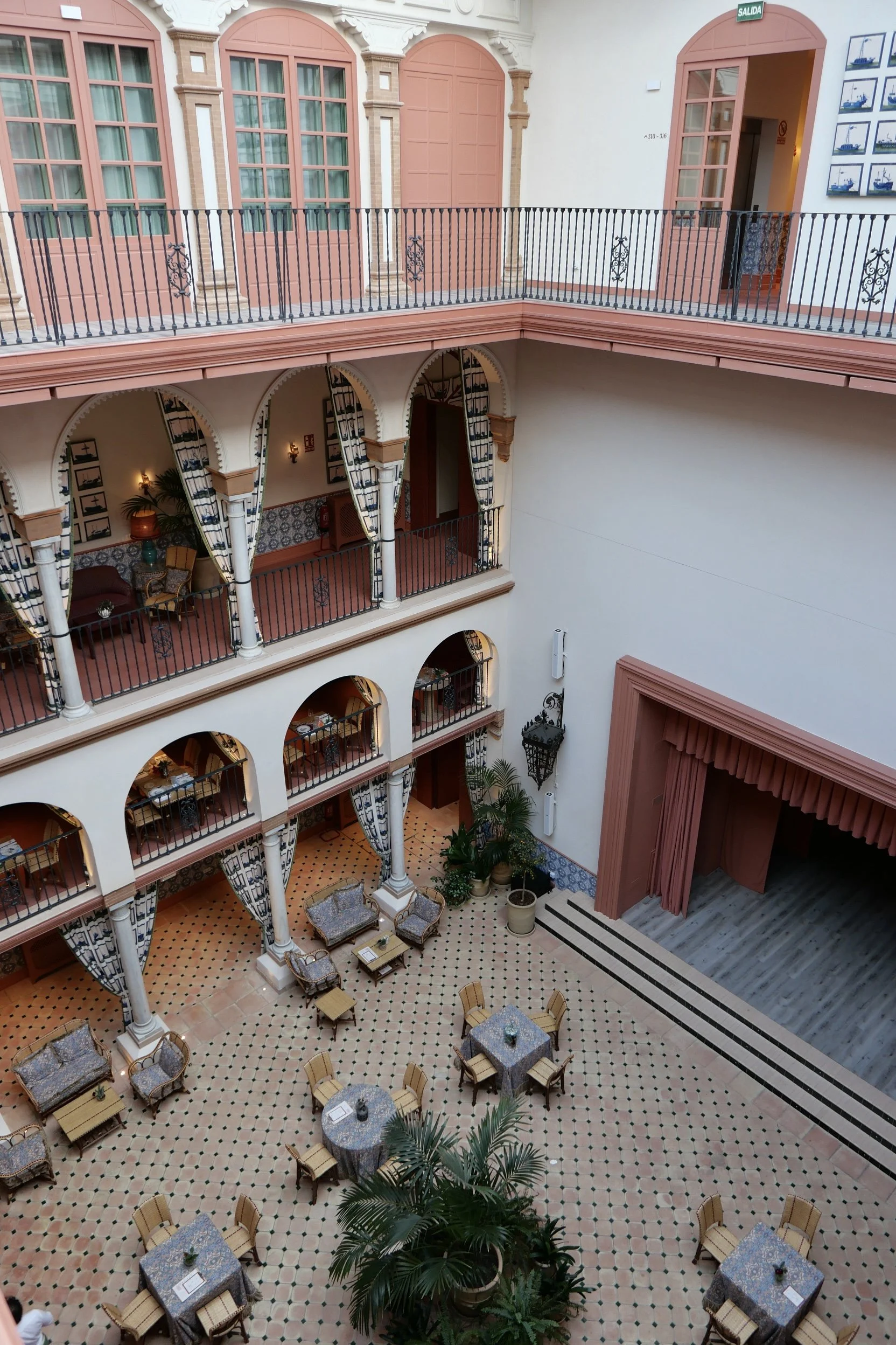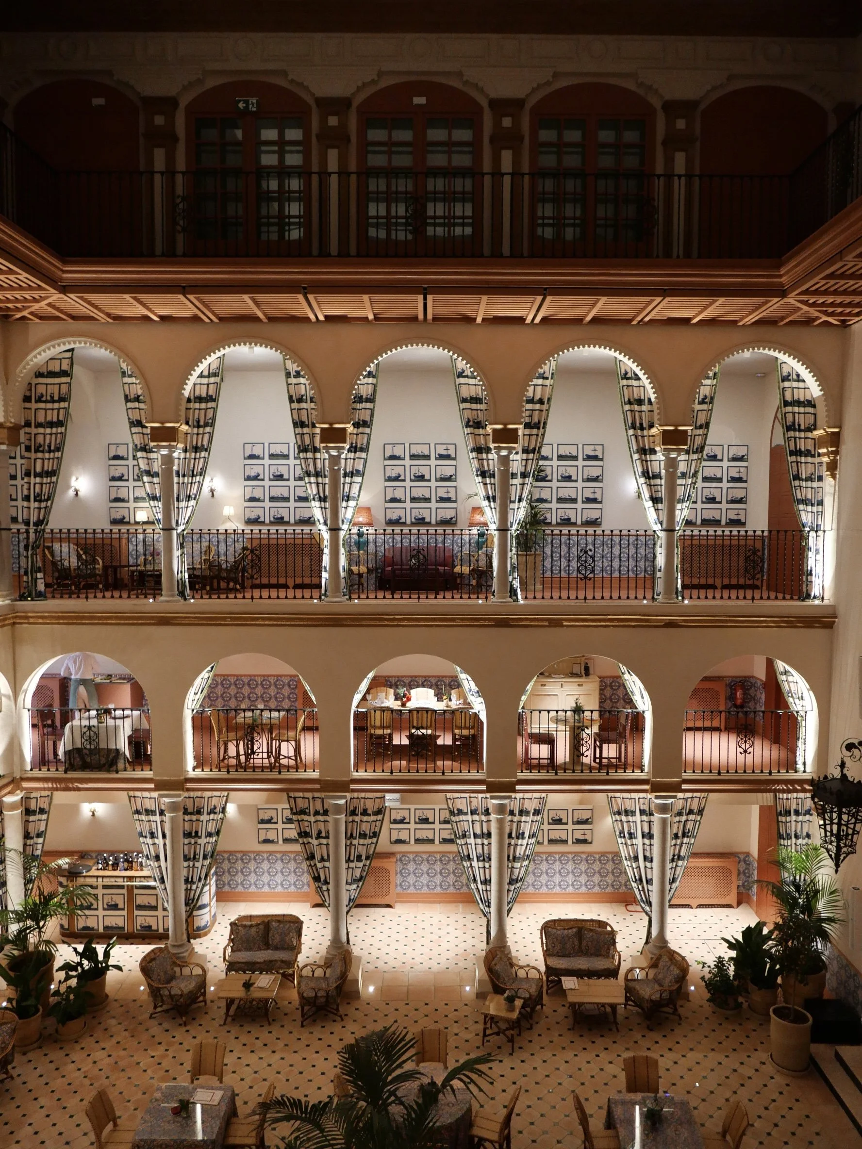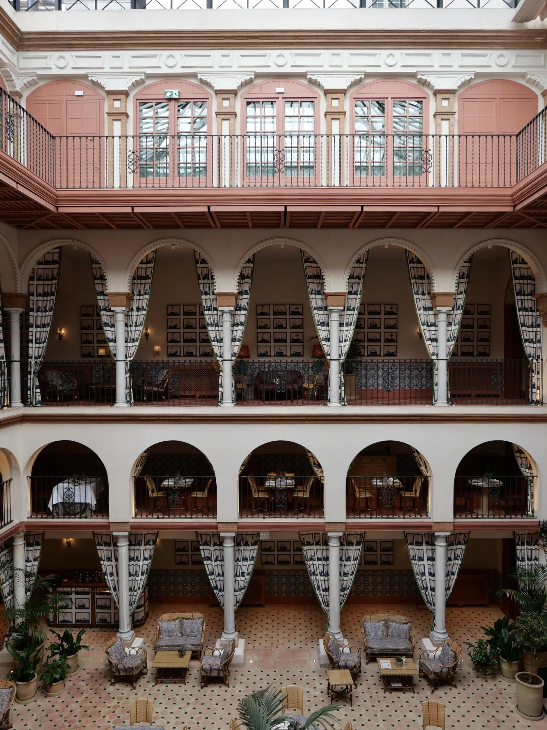 The building that the hotel is housed in used to be a theater, created by local architect Anibal González, who also designed the stunning Plaza de España here in Seville. The stage of the theatre is still intact but instead of rows of seats, the space has been turned into a bright courtyard, where the entire ceiling is made of glass, flooding the space with natural light. On the floors above, there are wrap-around mezzanines with portals, leading you to the rooms. The upgrade, when the journey of turning this dilapidated theatre into a Cristine Bedfor hotel was done by interior designer Lorenzo Castillo, who took inspiration from the Renaissance and the legacy of Spanish Baroque artist Velázquez.