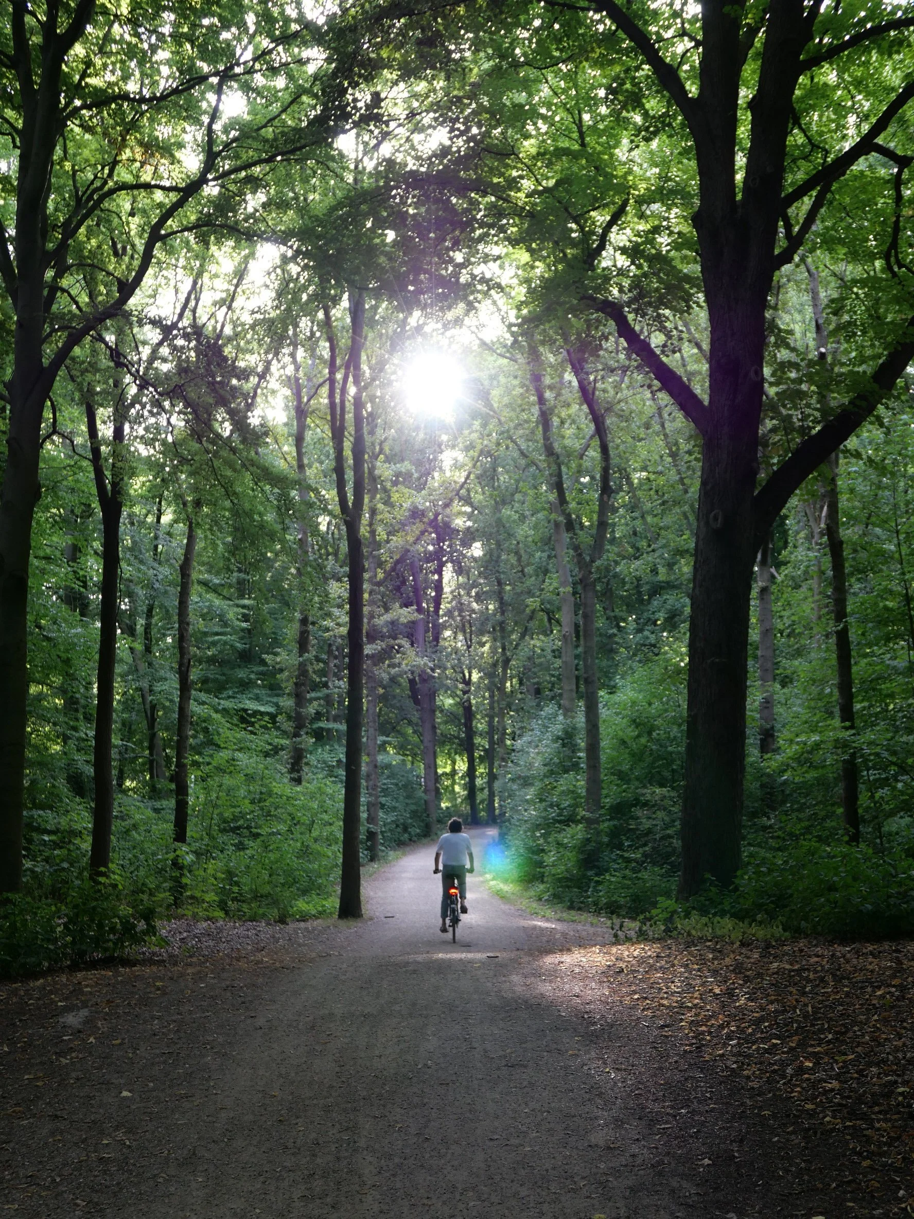 M biking back to De Plesman after dinner, through the wonderful Haagse Bos.