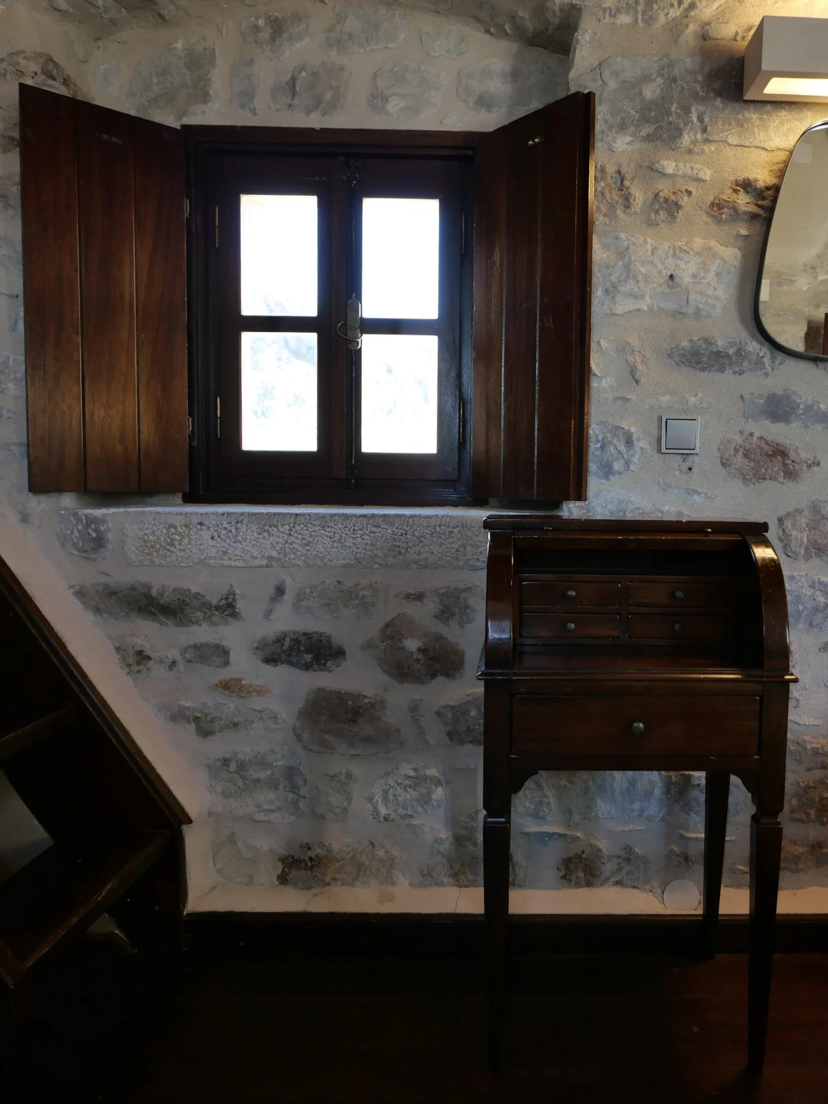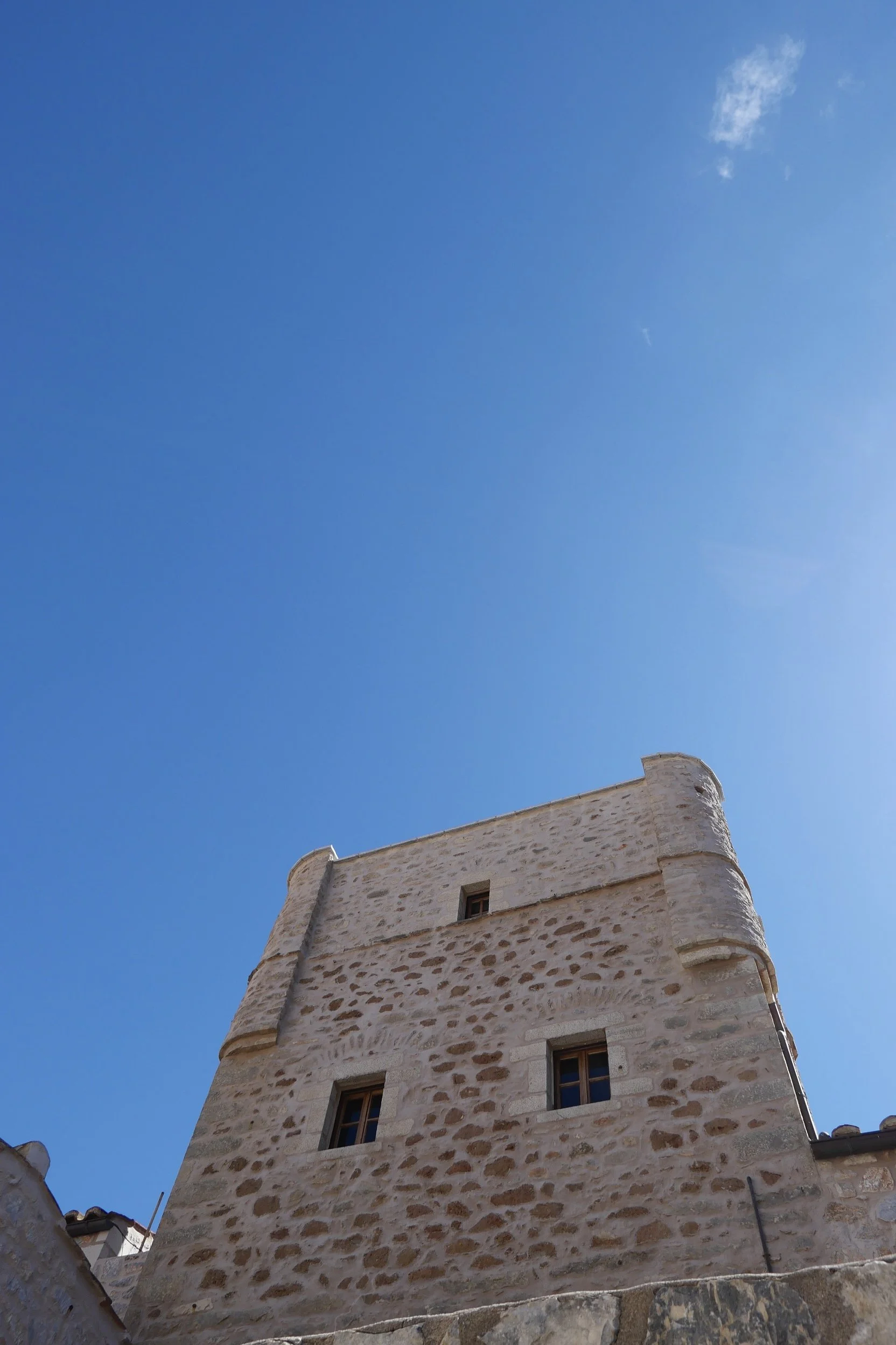 One of the stand out features among the different buildings is the tower. These kind of towers are seen across villages in this region and when I found out there was a room located in the actual tower at Kyrimai, of course I had to book it. The room was spread over three floors where the bathroom was on the first, bedroom on the second and the lounge on the top floor. The look is all about stone and wood. And the best part of staying in the tower, when you look outside you have stunning views of Gerolimenas Bay and the surrounding mountains.