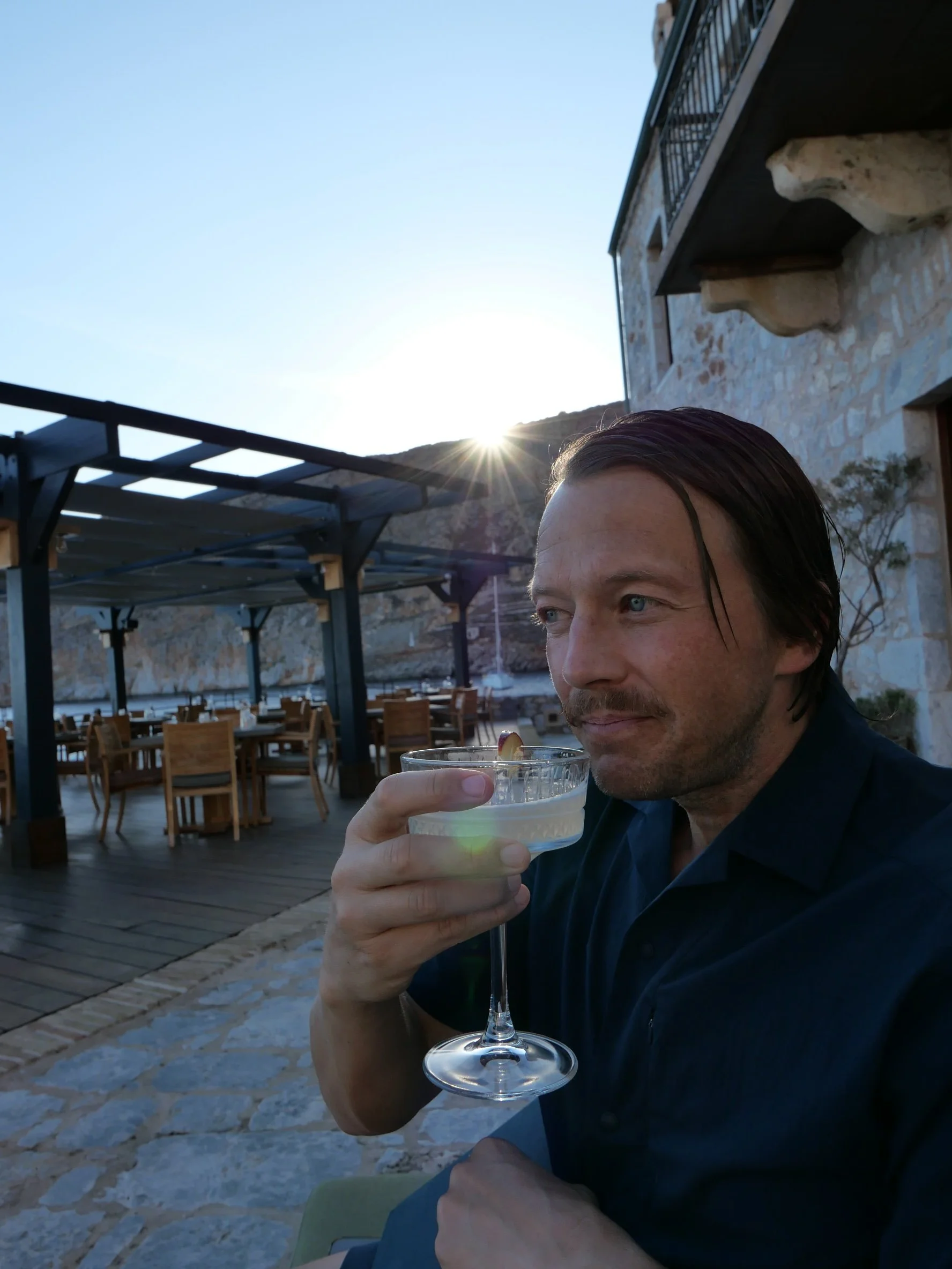 Then head back to the hotel for an aperitivo, with sea front views. Here is M enjoying something citrusy in the sunset.
