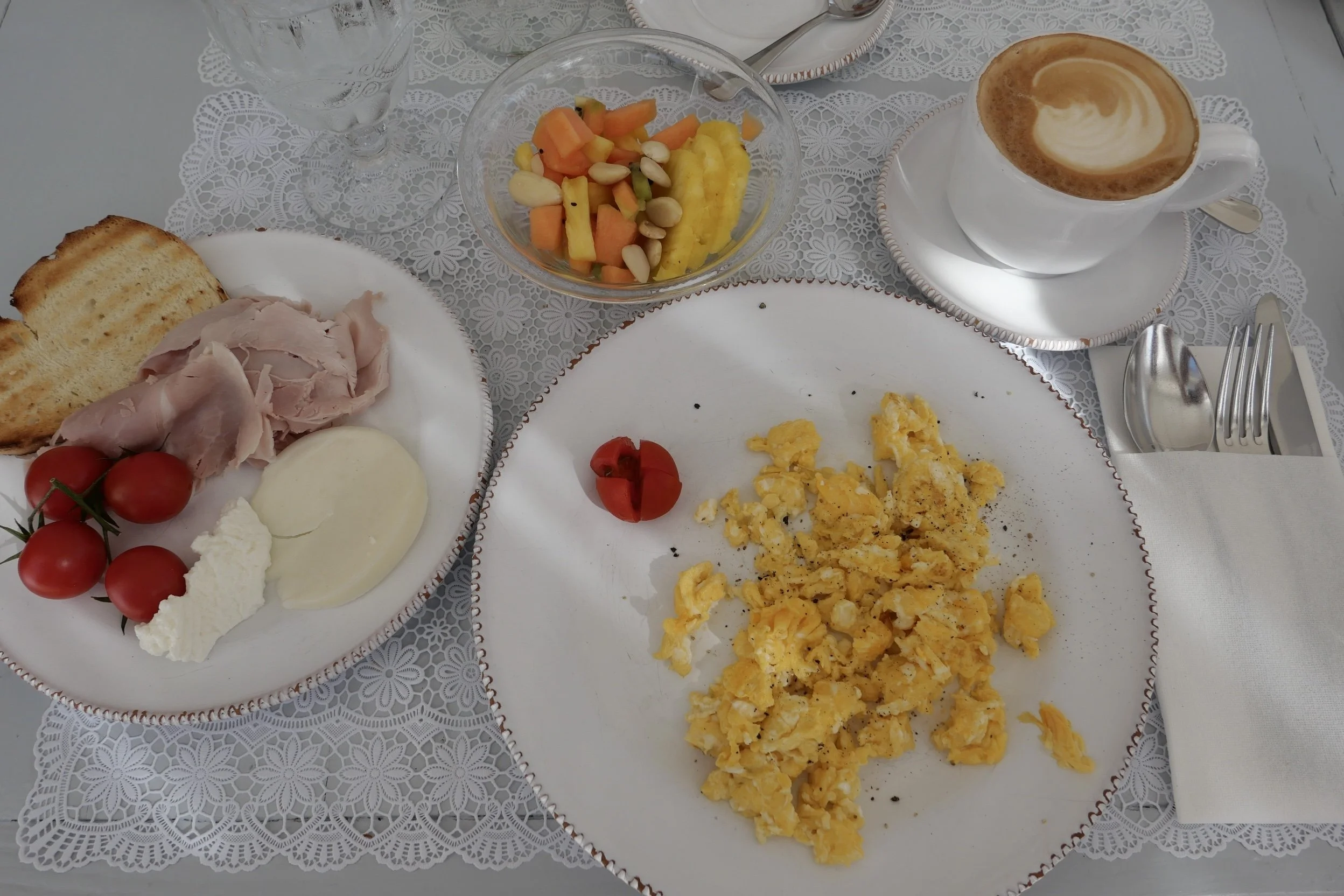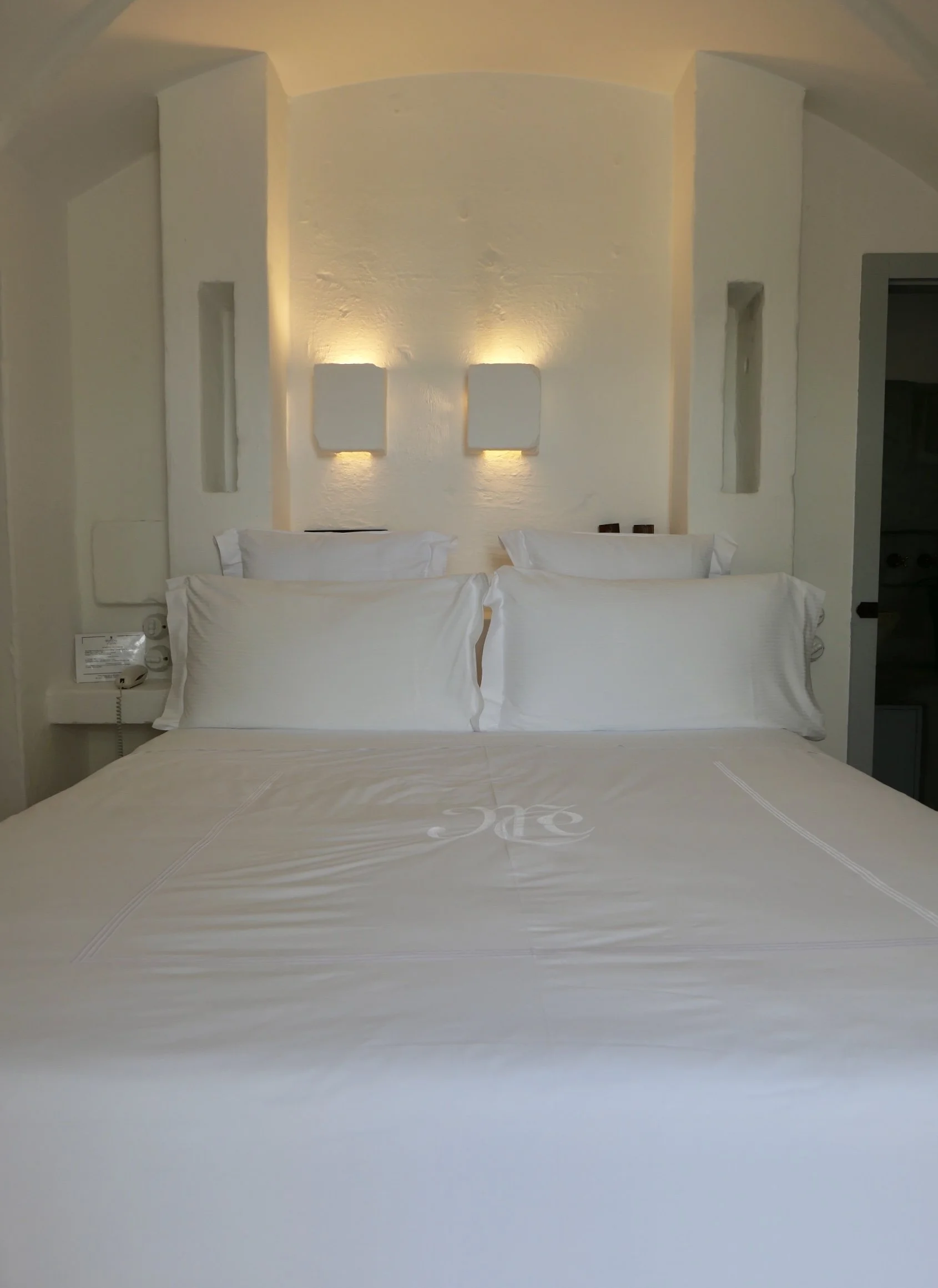 Our room was situated in the building across the courtyard from the main building and the inside was all white with a contrasting blue-grey color. One thing that stood out was that we had an open fire place in our room (which we never got to use considering it was already warm when we stayed here).