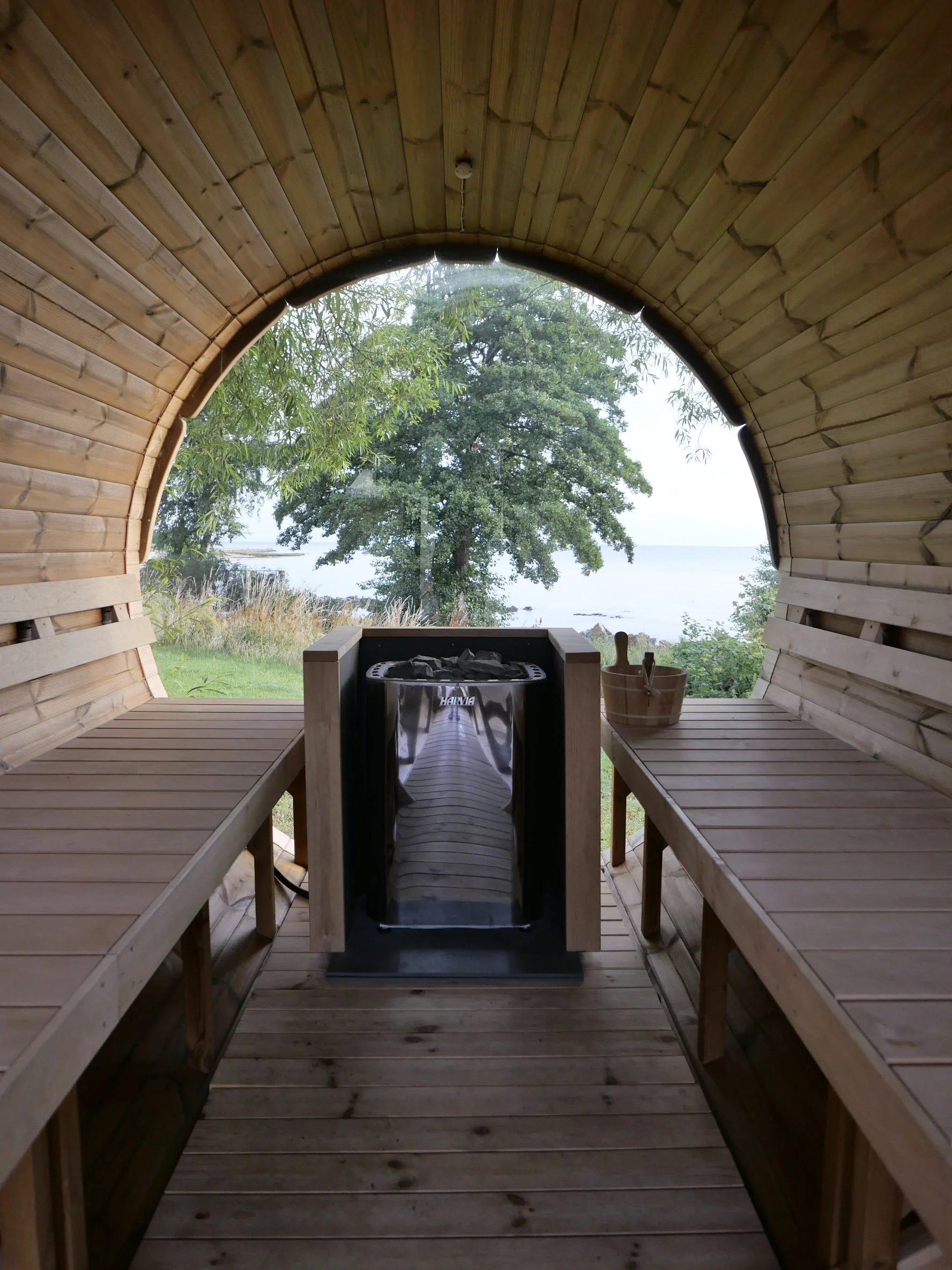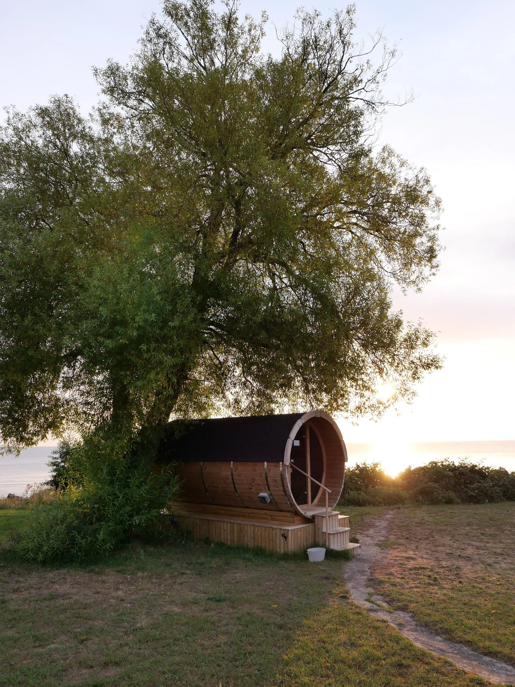 The sauna, hidden under a tree at the end of the garden