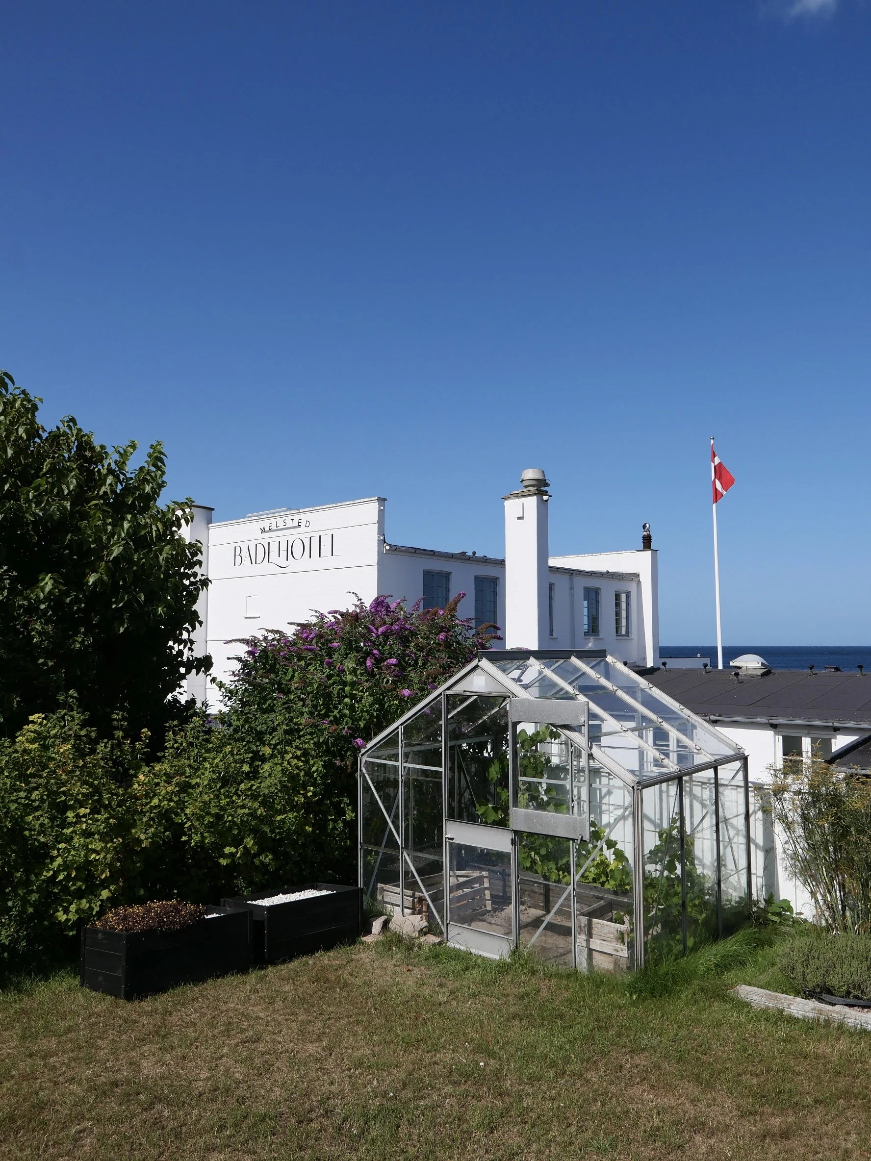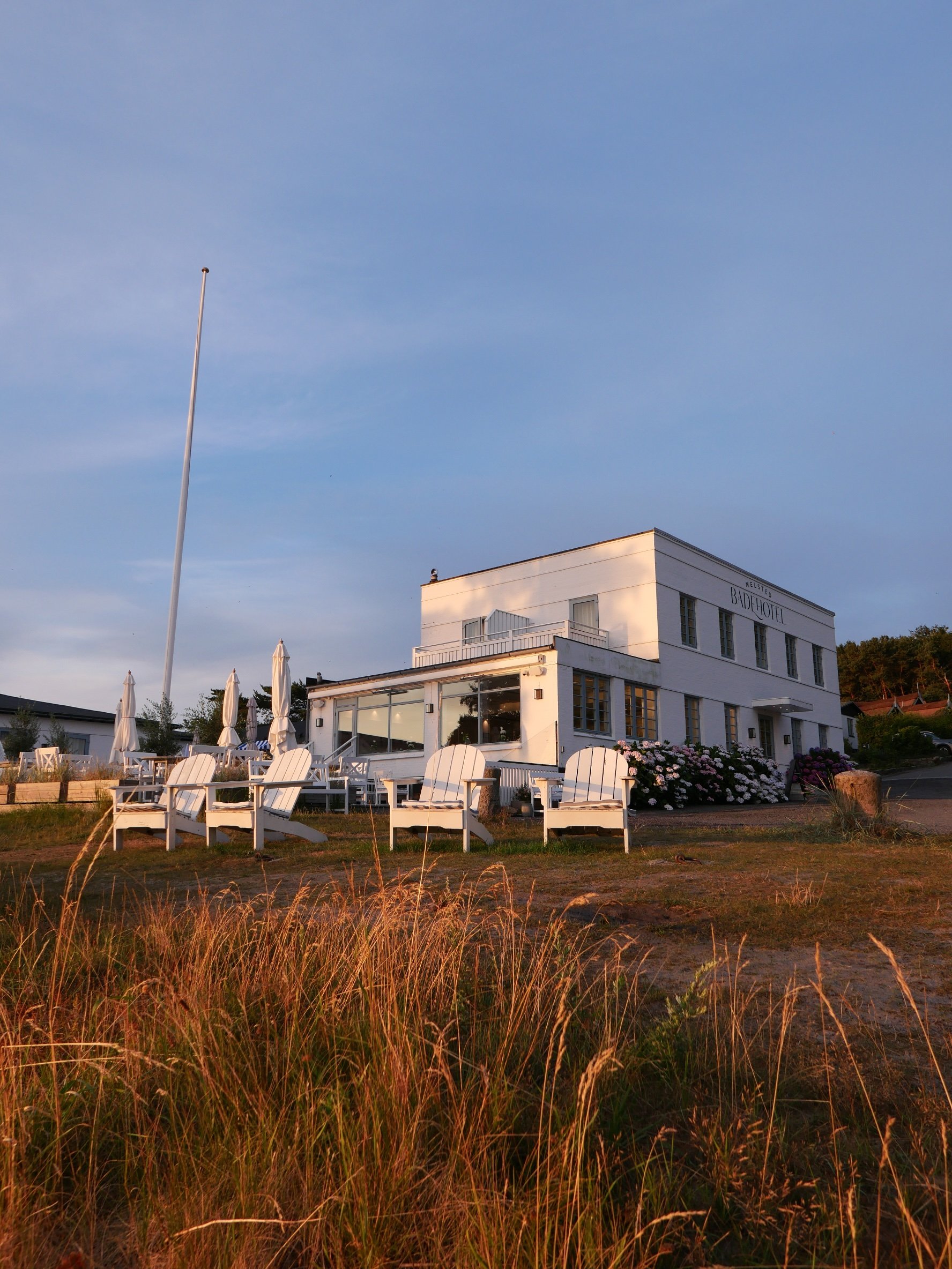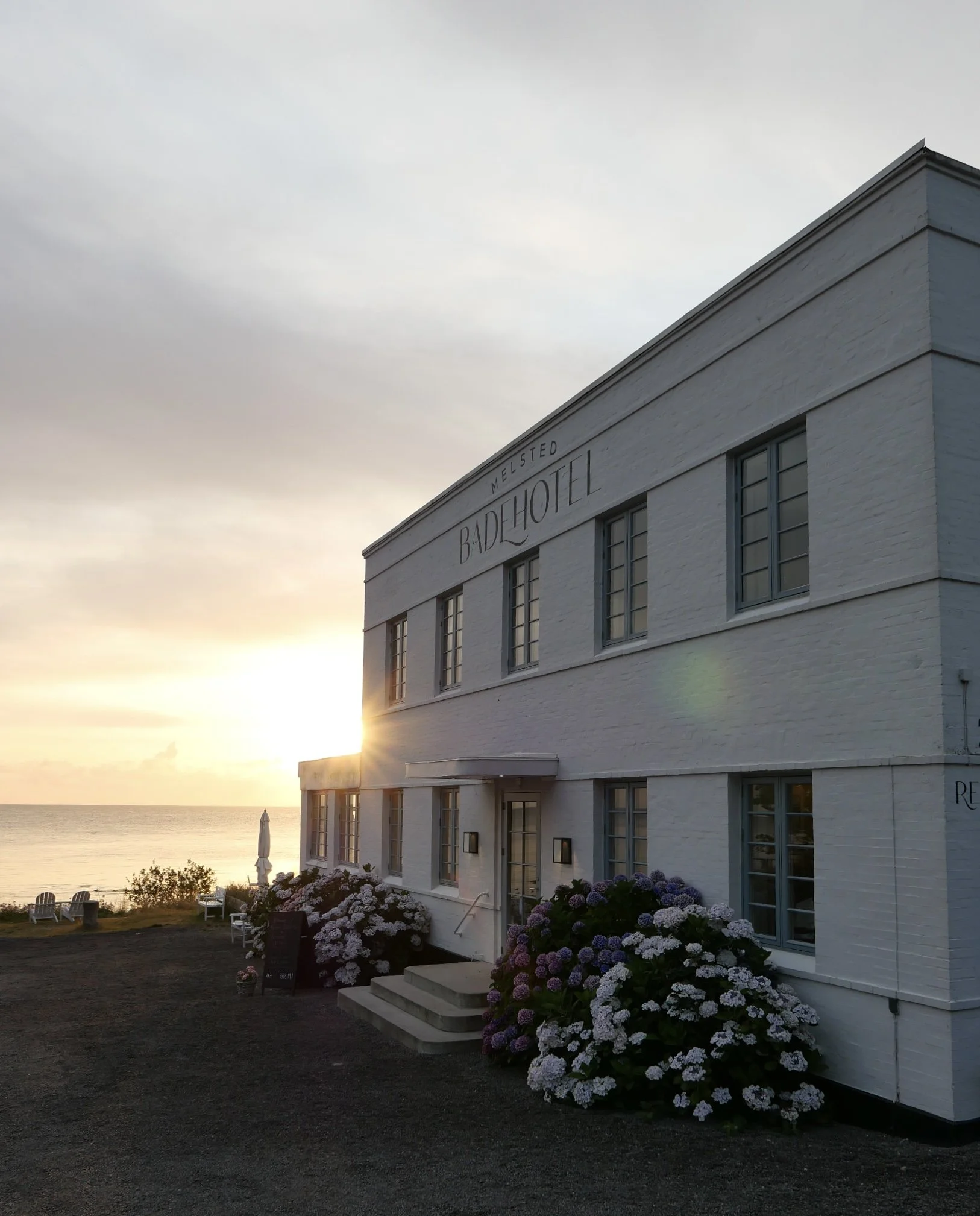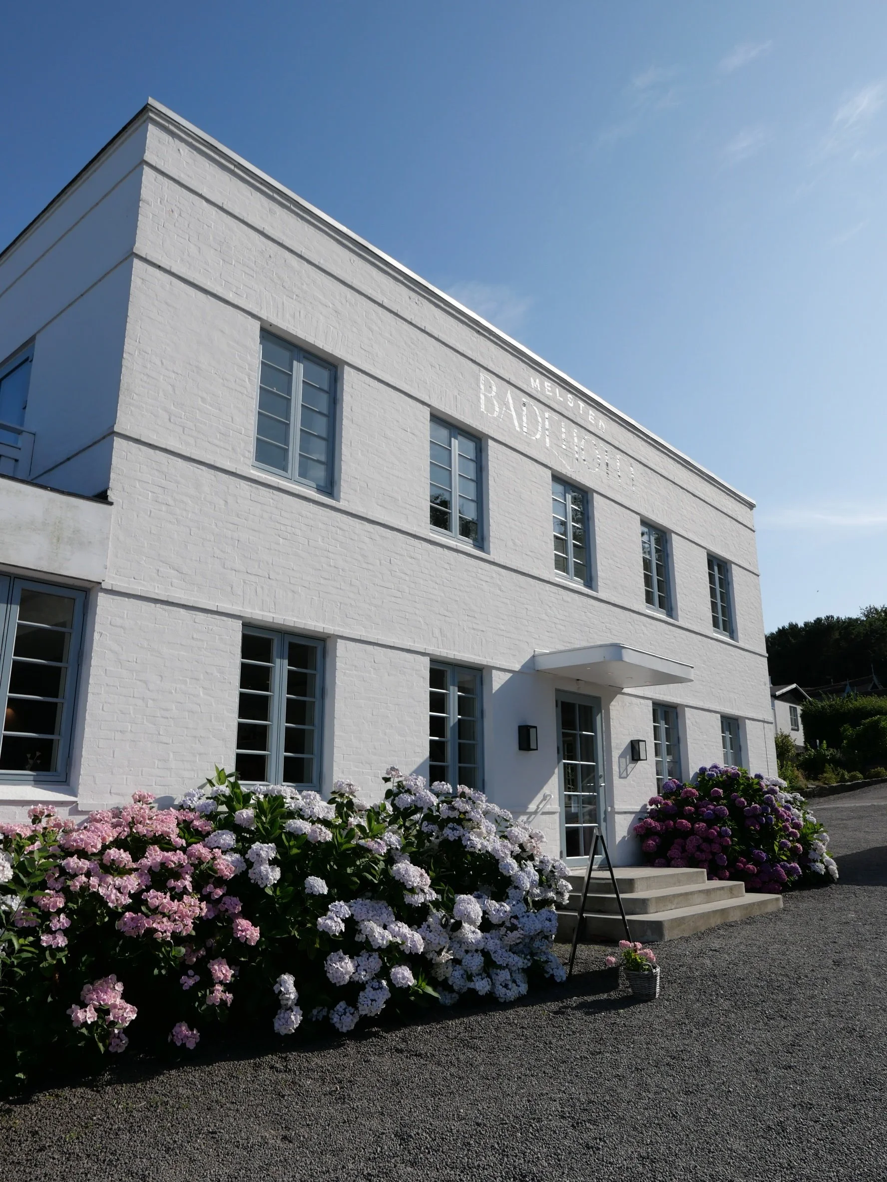 Welcome to the iconic Melsted Badehotel! A white Summer dream with massive hydrangeas framing the entrance.