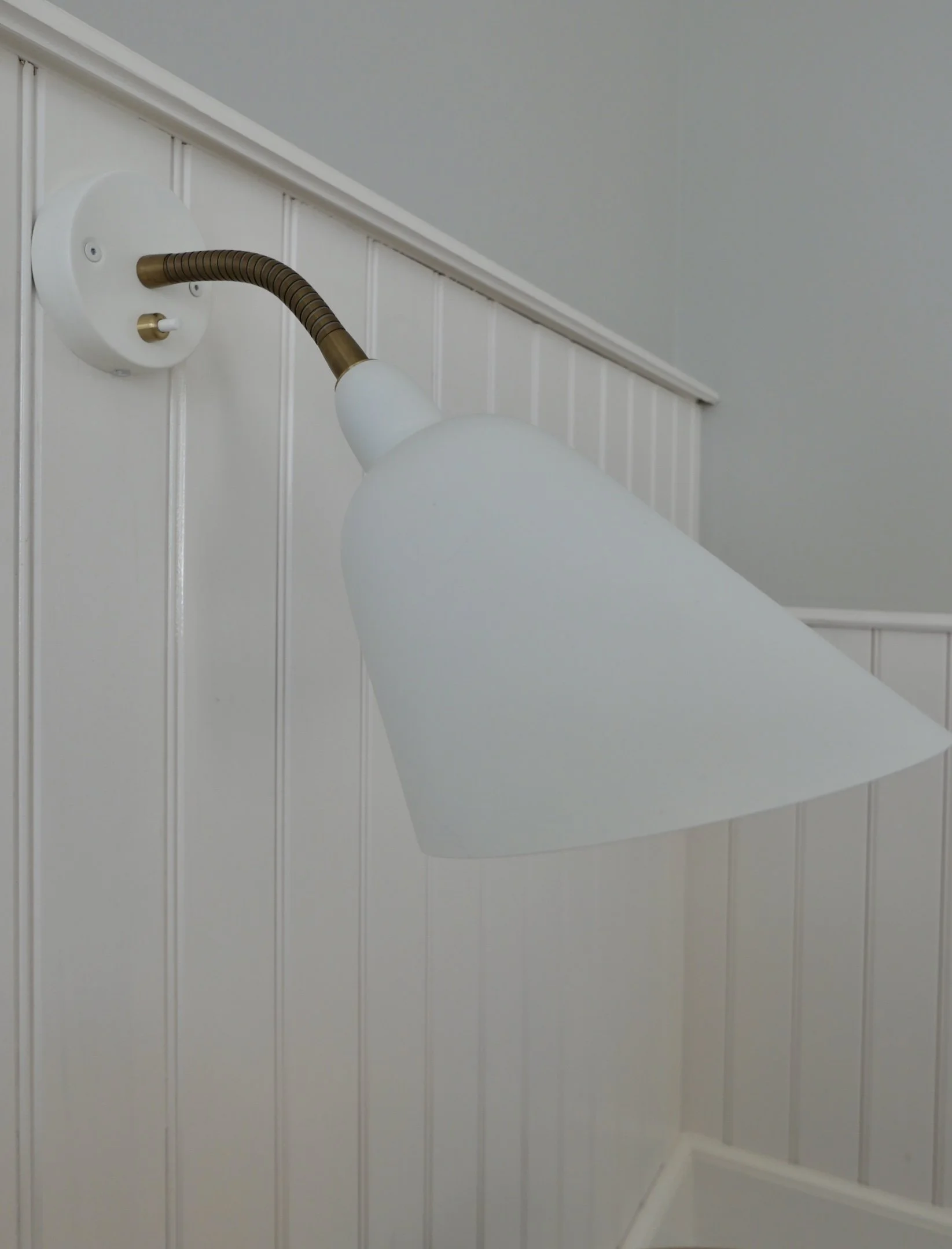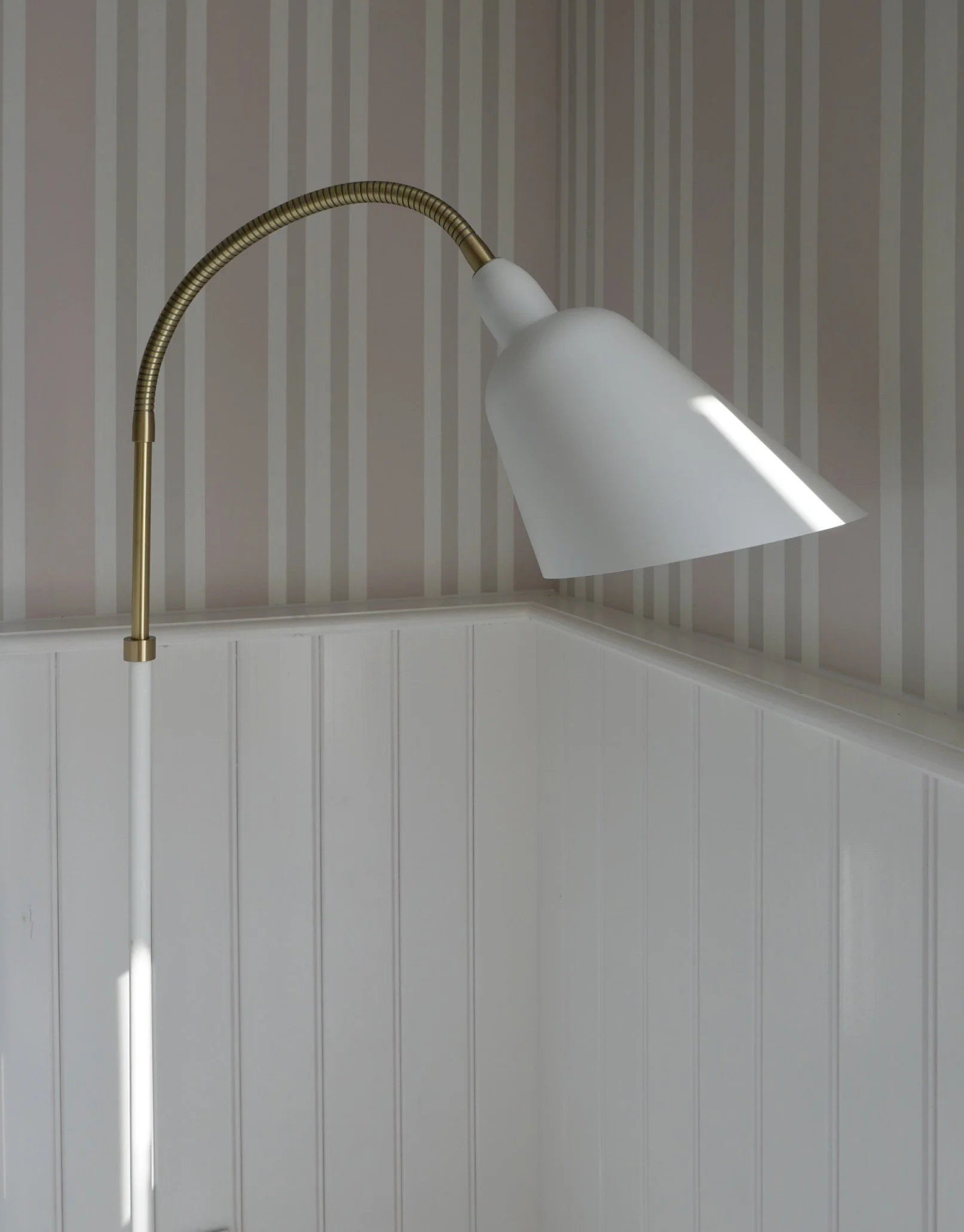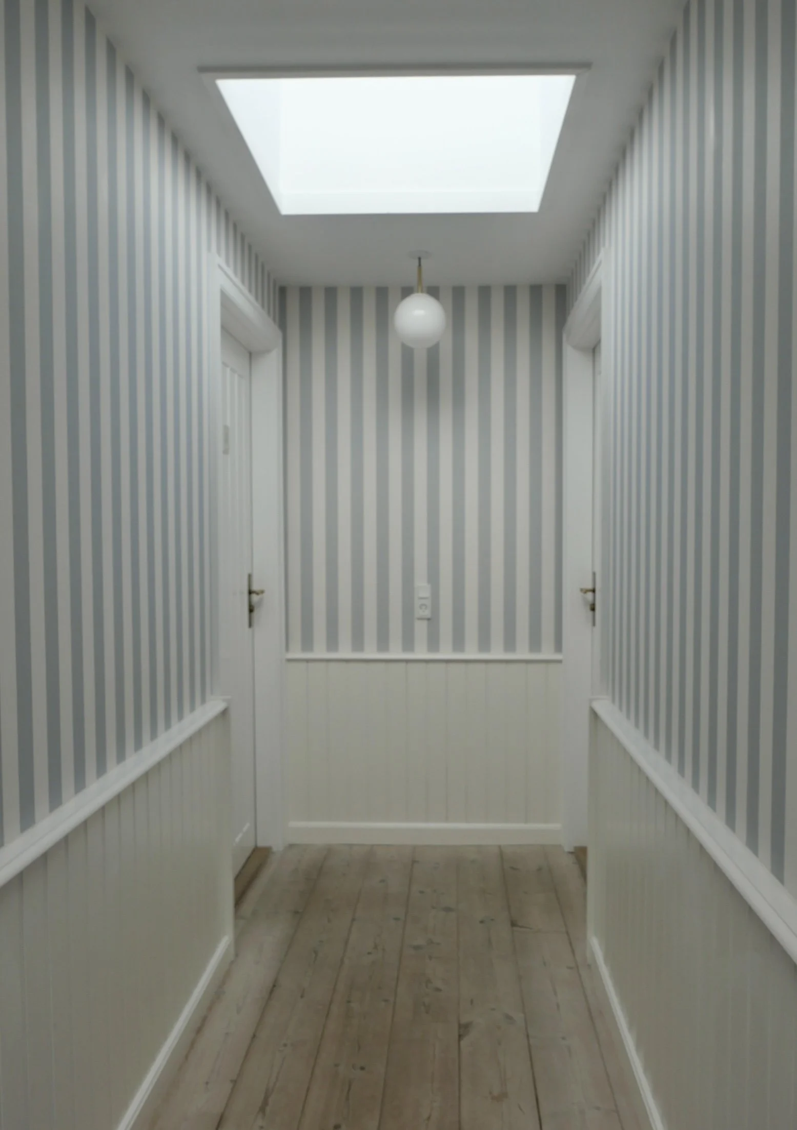 The corridor in the main building with that classic badehotel look, white panelling and striped wallpaper.