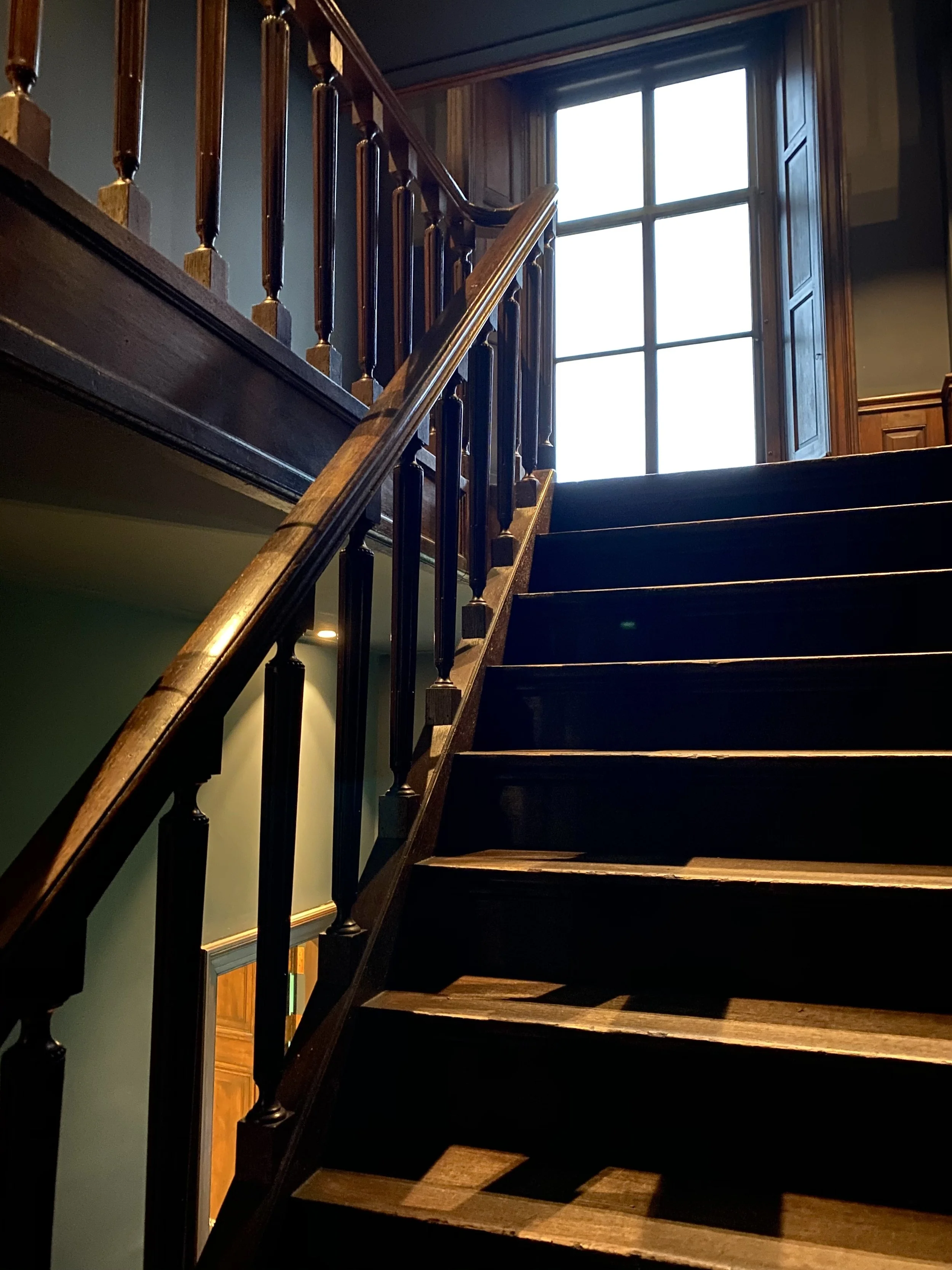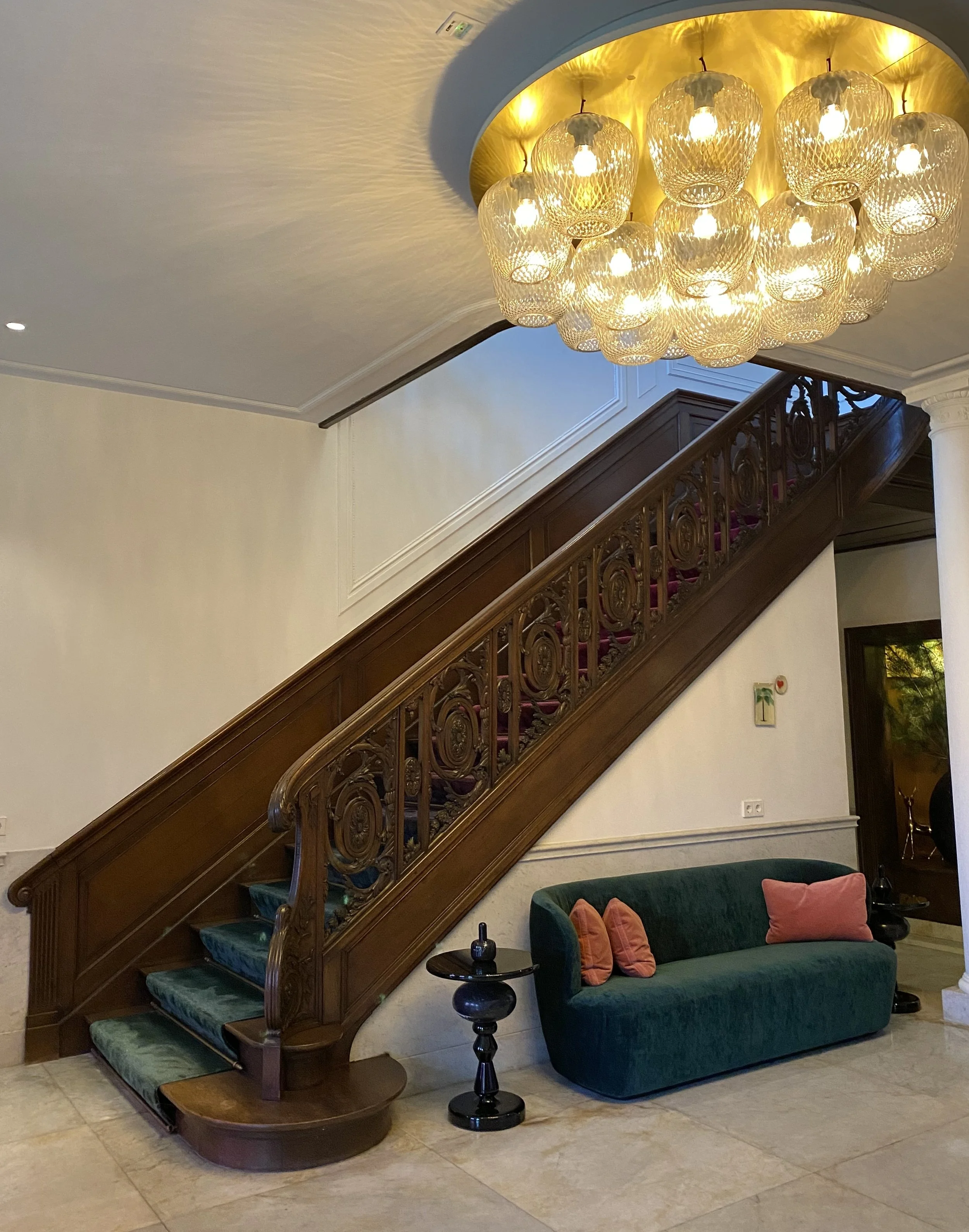 Old and new. I love the marble and the old, wooden staircase and how it marries with the modern looking furniture.