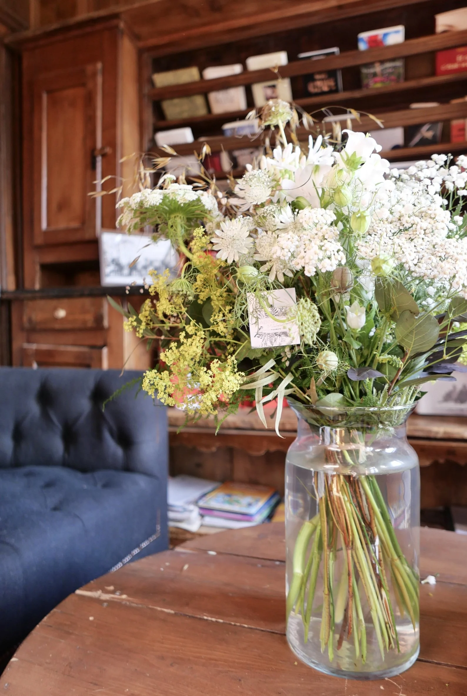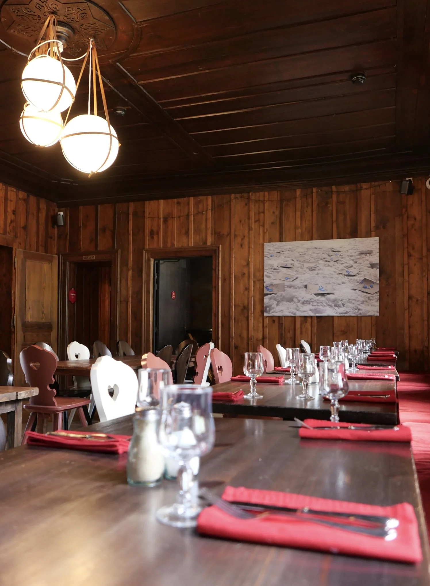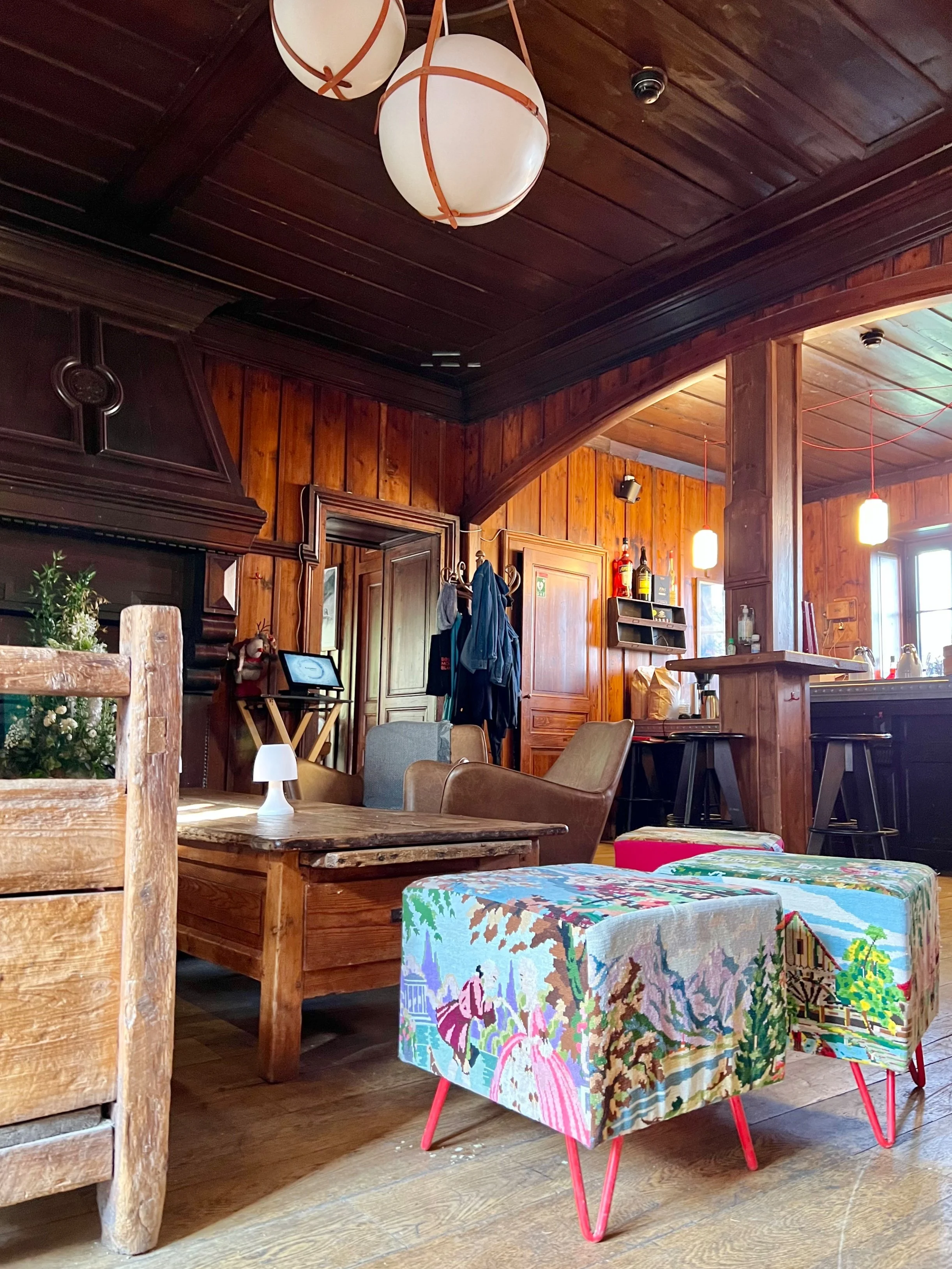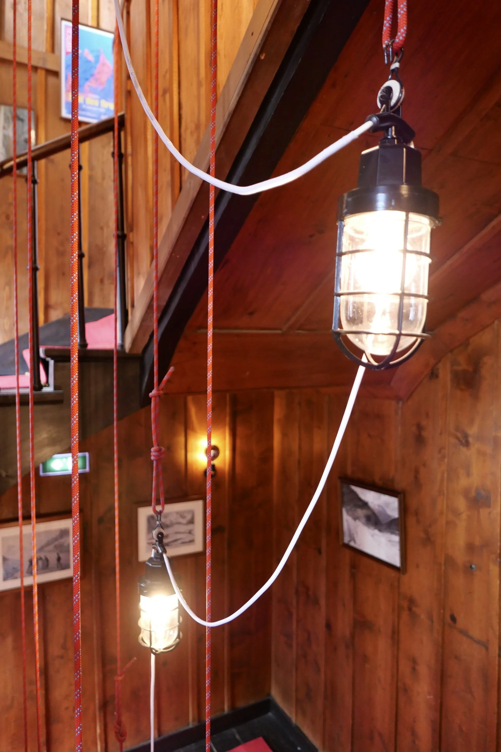 All the 20 rooms are named after famous historic people who has once visited the site. We stayed in the Mary Shelley (the mother of Frankenstein) room facing the Aiguilles des Drus mountains. The interior has a kind of shaker inspired look with reclaimed dark wood and fairly strict design, but with more colors. Most of the furniture has been repurposed with modern takes on local, traditional patterns and is completed with old leather trunks, porcelain lamps and mountaineering paraphernalia.
