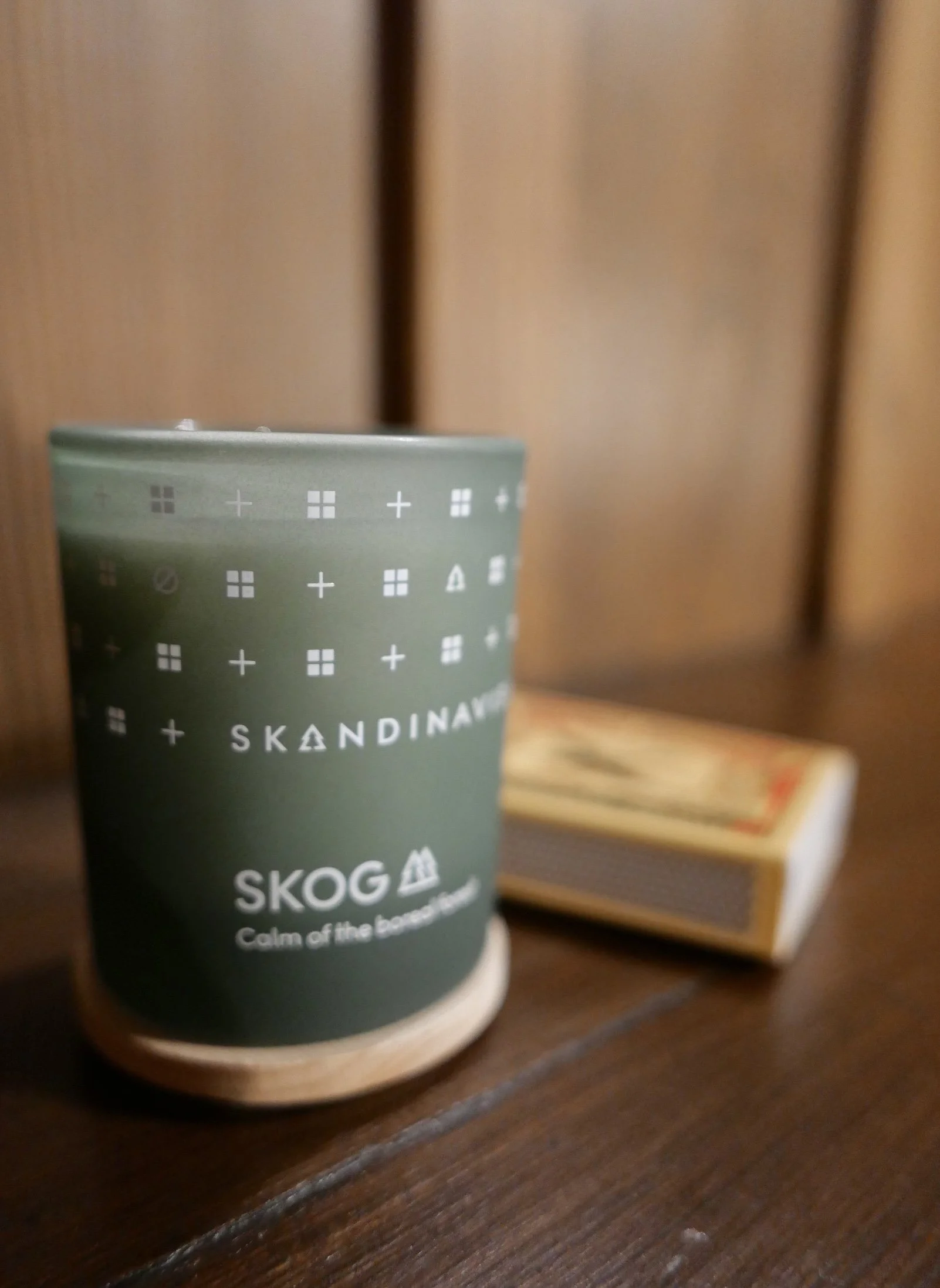 The accent color is red which really stand out among all the wood and the mountaineering paraphernalia.