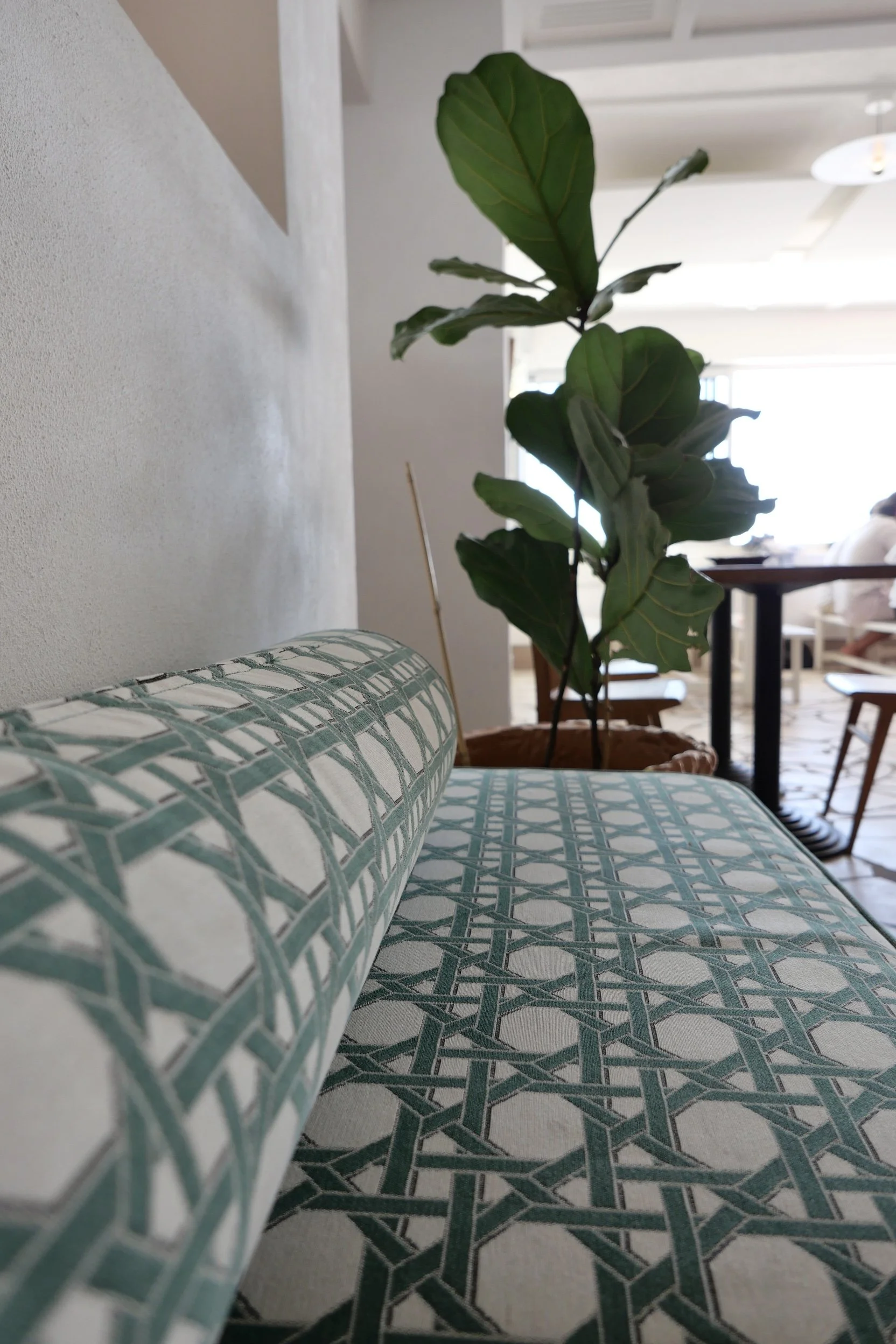 The retro vibe in the lounge is everything. Love the pattern on the cushions.