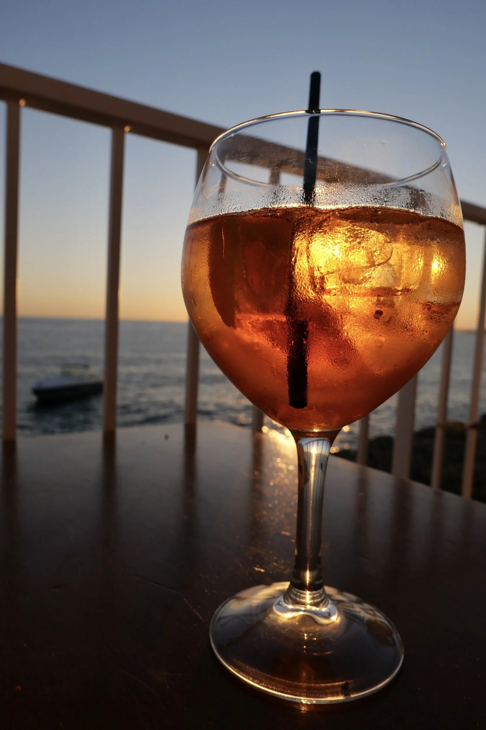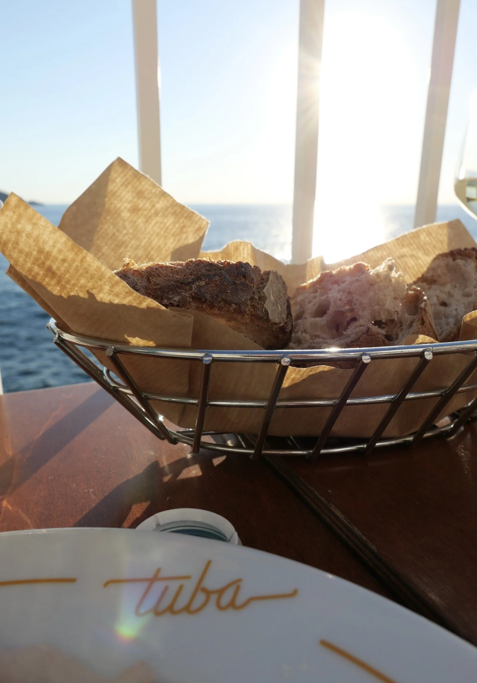 M is enjoying dinner at Tuba Club as the sun sets over the Mediterranean.