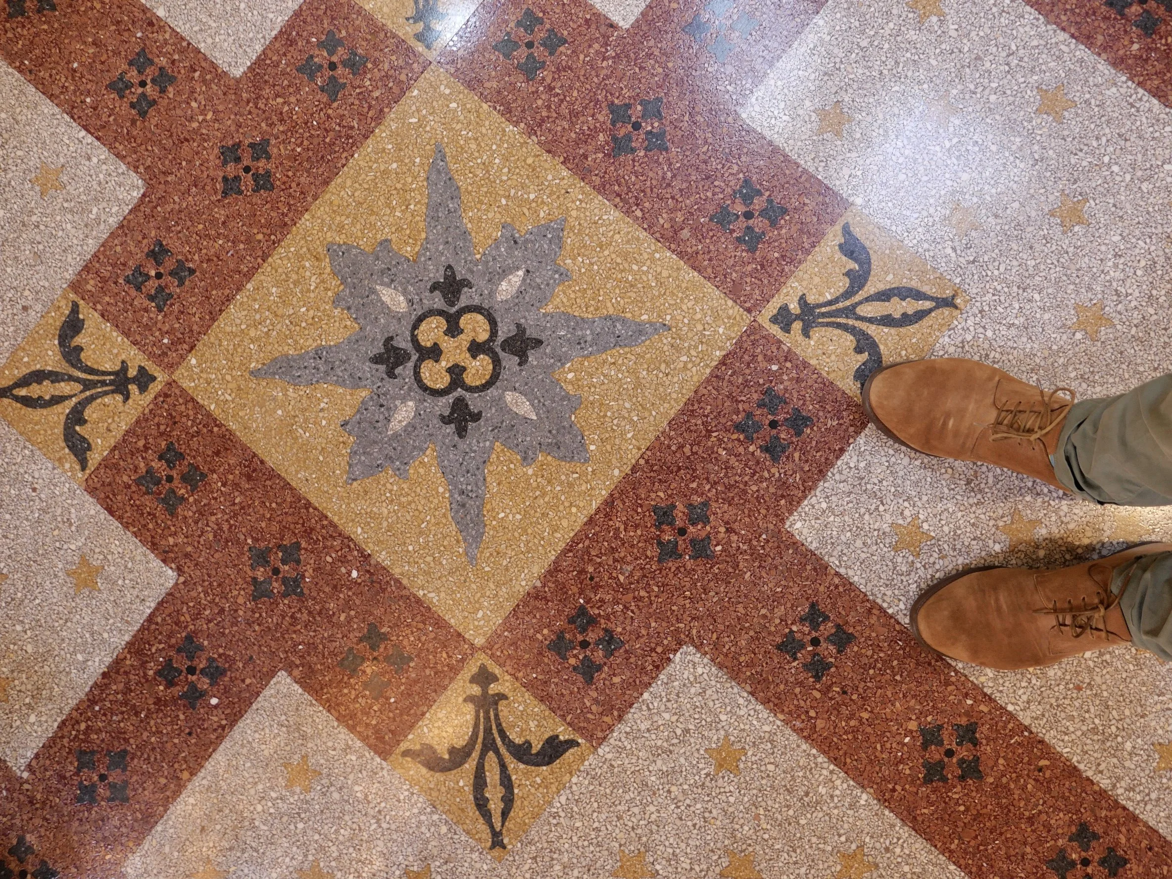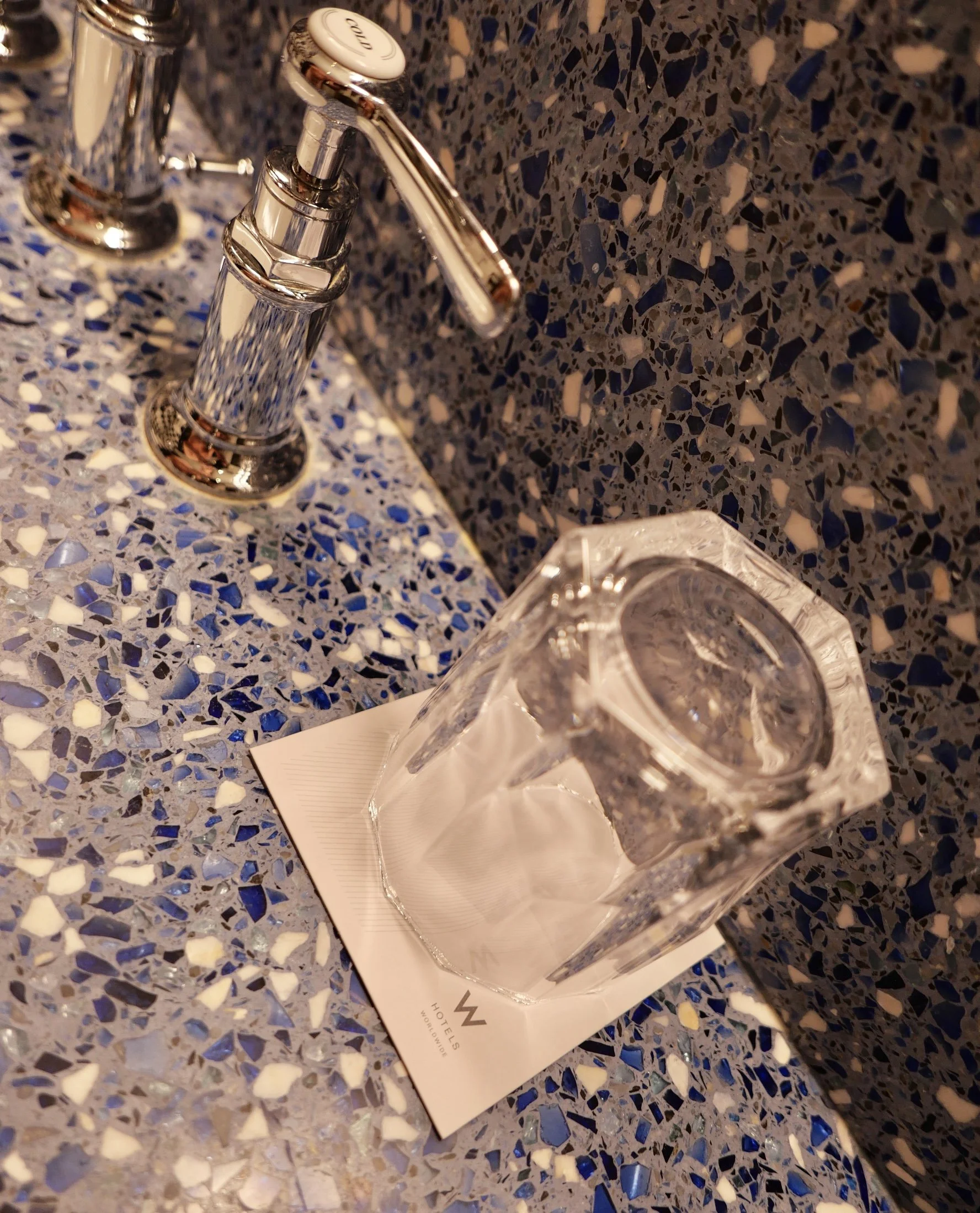 Terrazzo is one of my favorite materials. I have never before seen a blue version like the one in my bathroom.