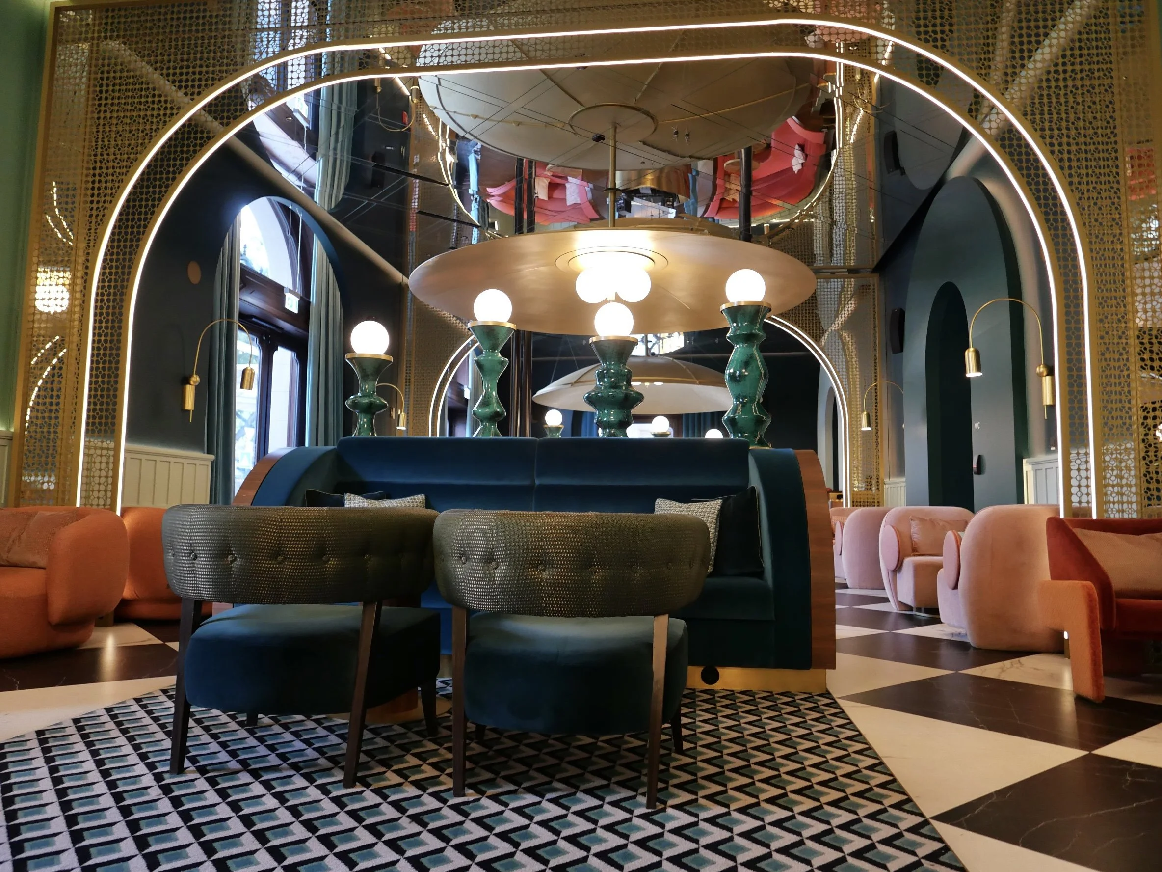 The most dramatic area is the bar/lounge area with sleek light installations and chunky velvet furniture in all kind of colors.