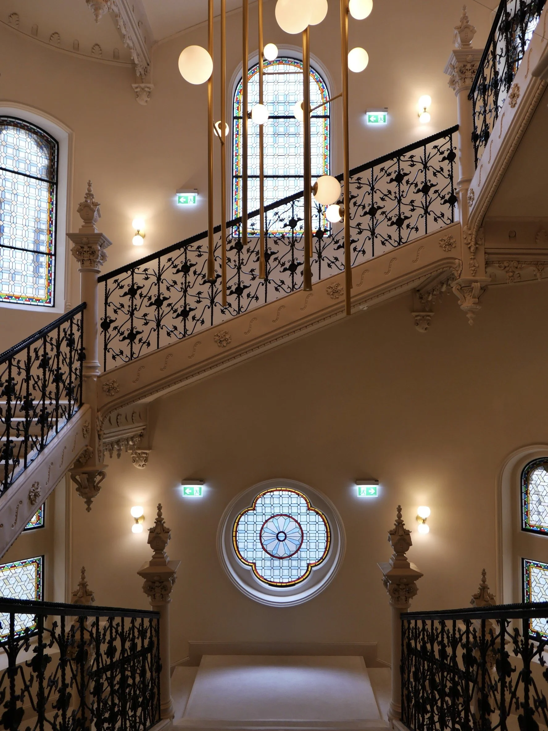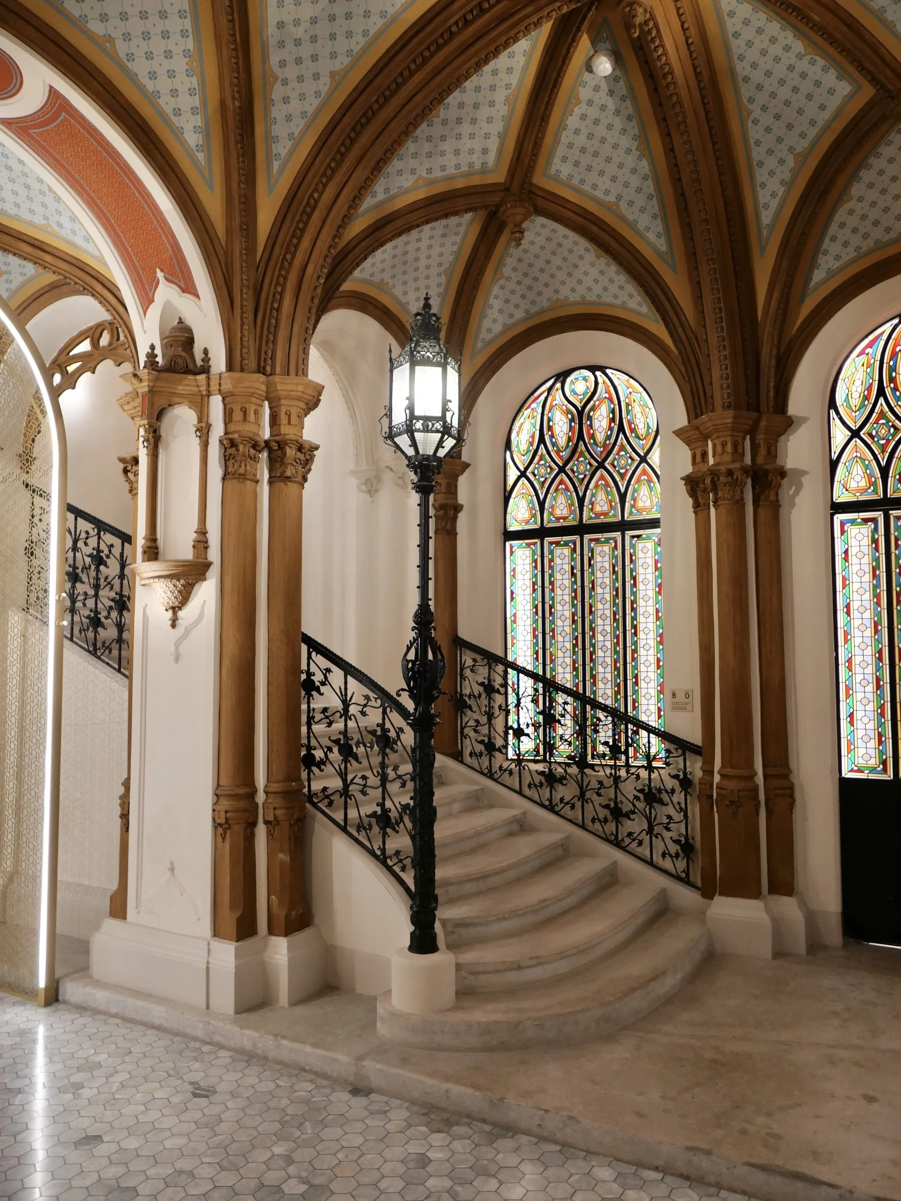 My favorite part of the hotel, the majestic staircase with the ornate wrought iron banisters and stained glass windows.