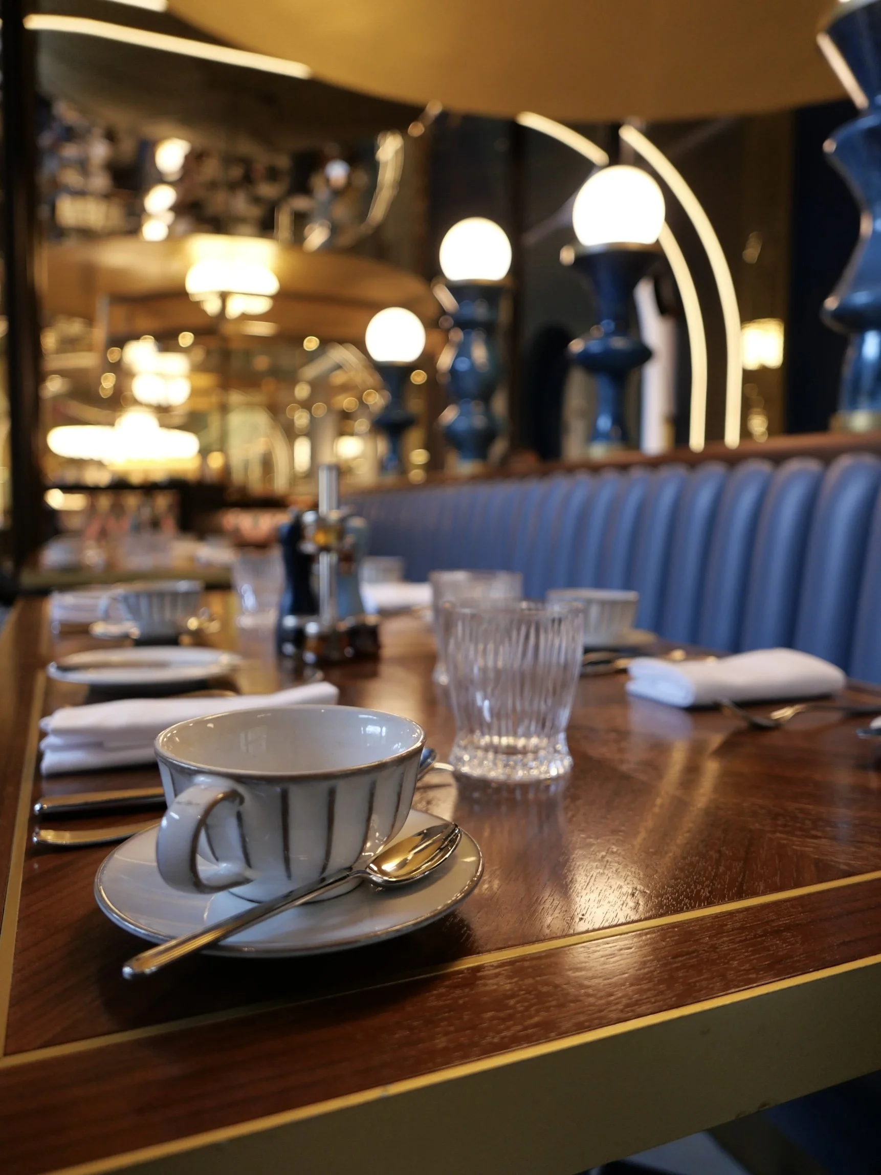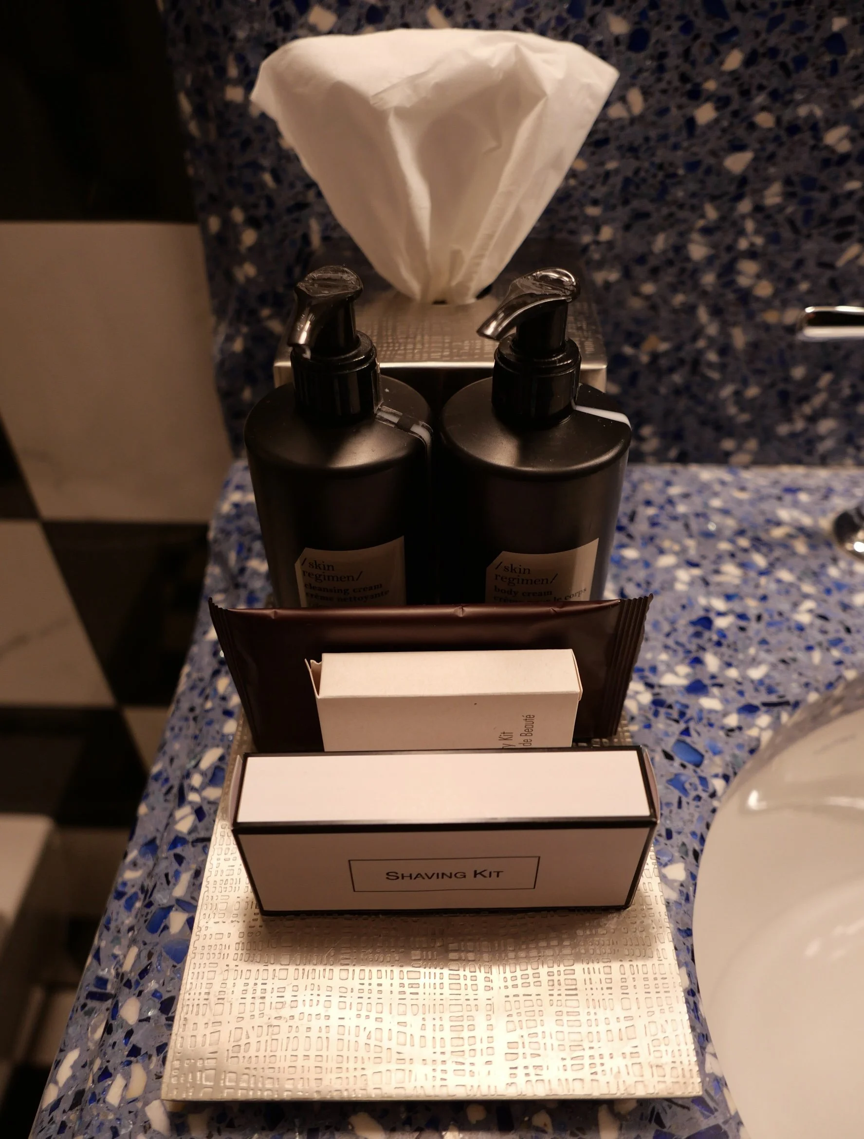 There are 151 rooms in this hotel, which W themselves call the most impressive hotel to date. The design, created by firms Bowler James Brindley and Bánáti + Hartvig, deserves a separate blog entry. It is just so unique, giving almost an Alice in Wonderful vibe. A lot of the old Neo-renaissance features are still there but have been combined with a totally unique color mix of soft coral, deep blue, forest green and turquoise. There was so much to take in that I almost started to feel lightheaded at one point. Going from the dimly lit cave-like entrance, via the glass ceilinged courtyard and the old staircase with ornate railings and stained glass windows to the turquoise hallway with checkered marble floors before reaching my room. The first thing you see when entering the room are the checkered wooden walls leading you towards the powder blue colored room, filled with unique furniture with an Art Deco vibe and patterned carpet.