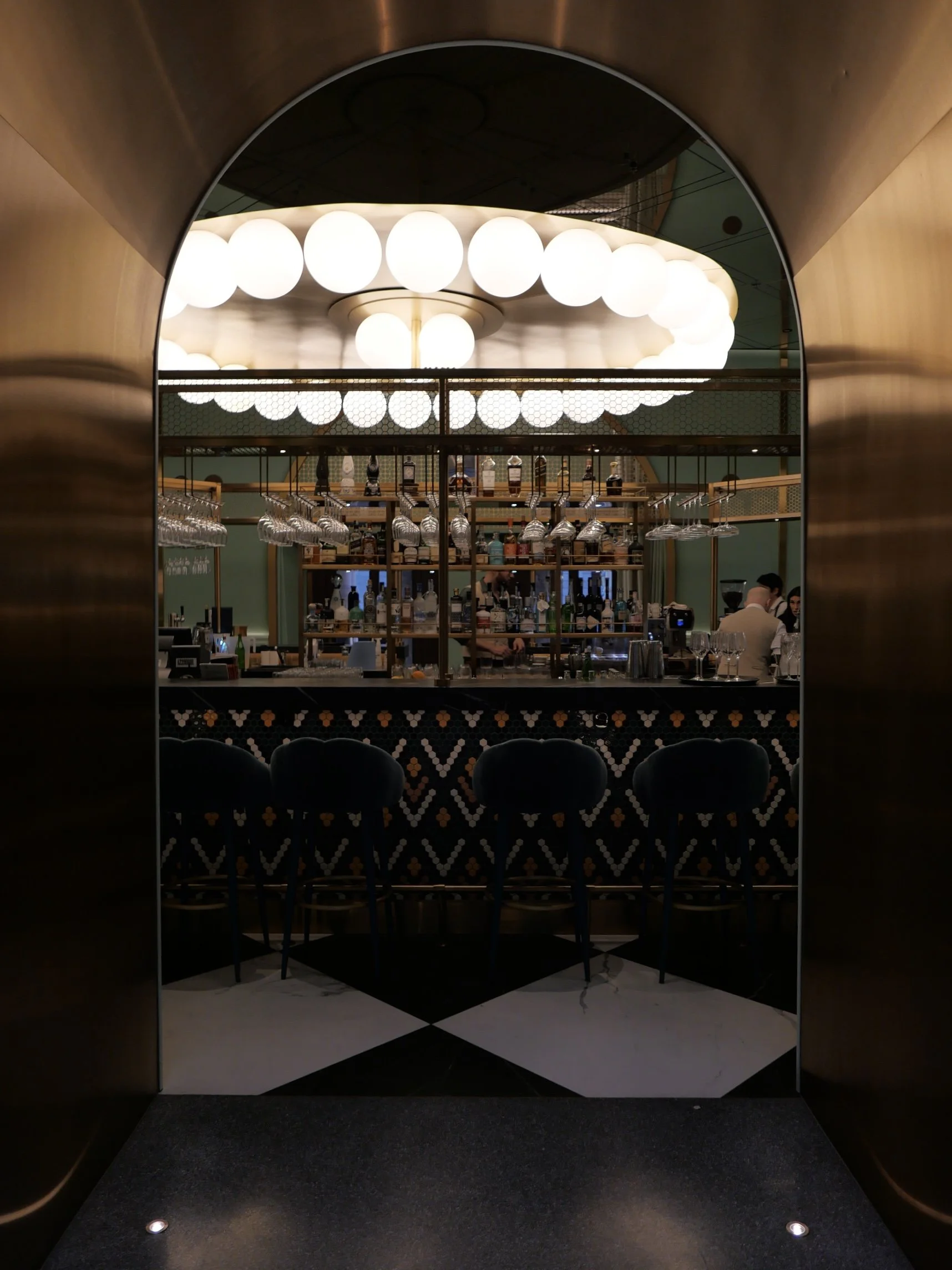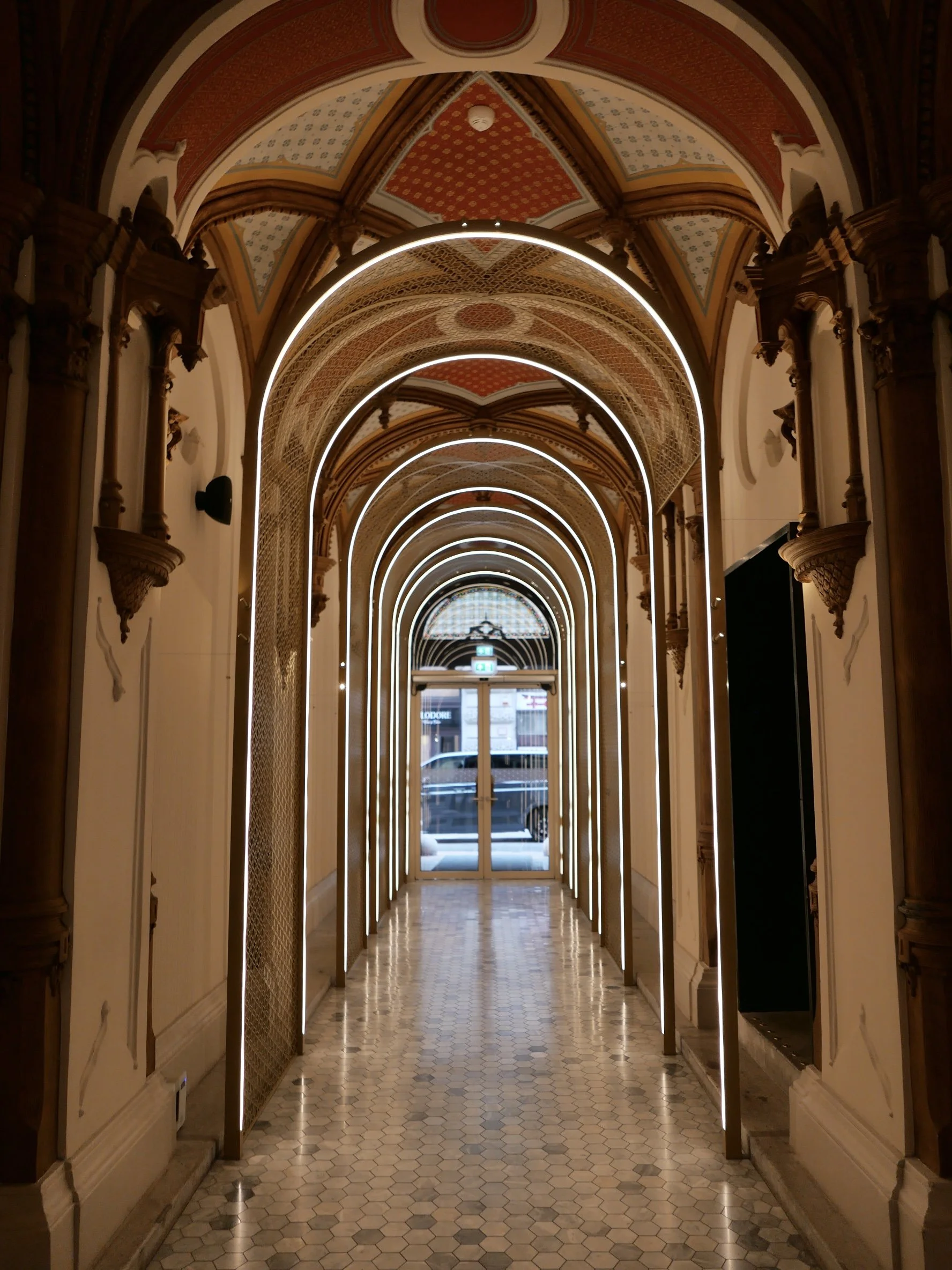 The arched entrance to the bar/restaurant. The are like a modern, metal version of the archways on the exterior.