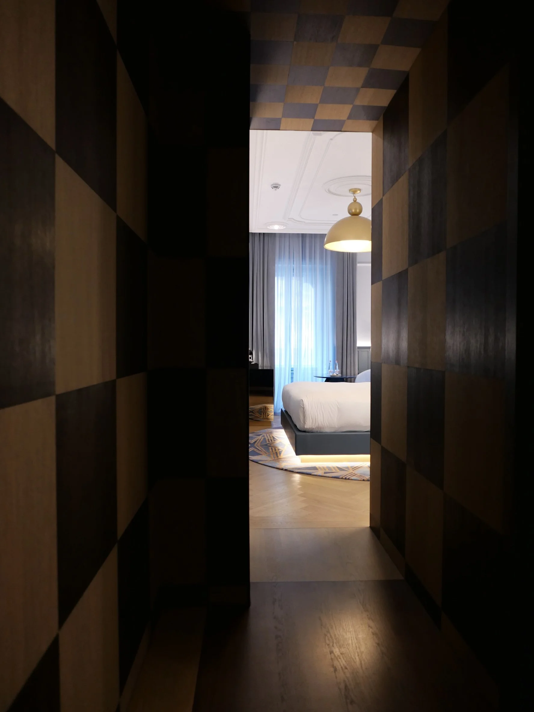 Entering my room. Never seen this kind of design feature before, checkered wooden wall panelling.