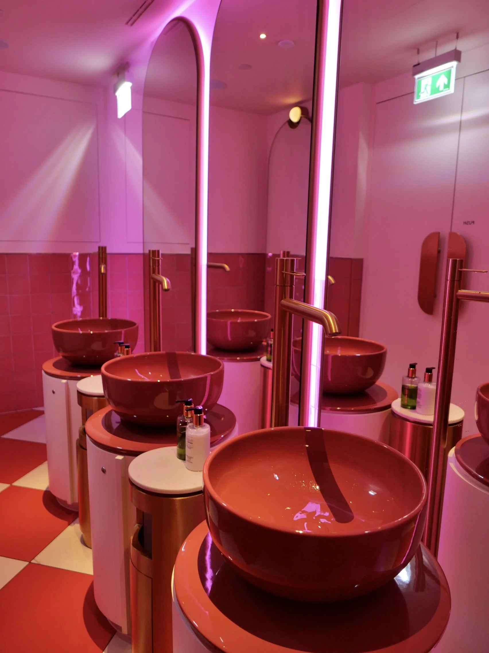 One thing I love to do when staying at hotels is to check out the staircase and the public bathrooms. To me they say a lot about a hotel's design ambition. If they have invested in these areas as well as the more outward facing ones, you know they take design seriously. Like this amazing looking bathroom next to the bar, all in soft pinks and vivid raspberry red.