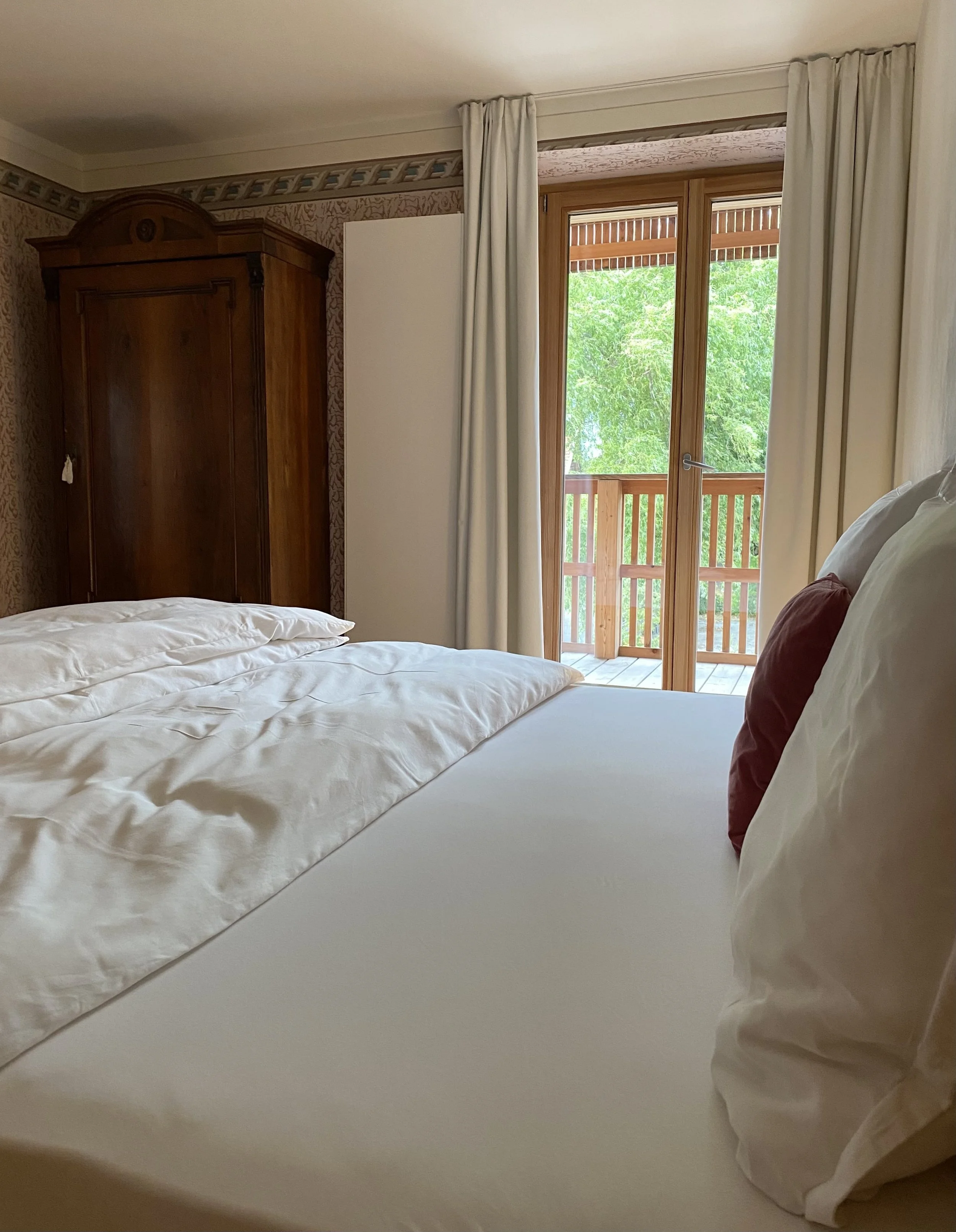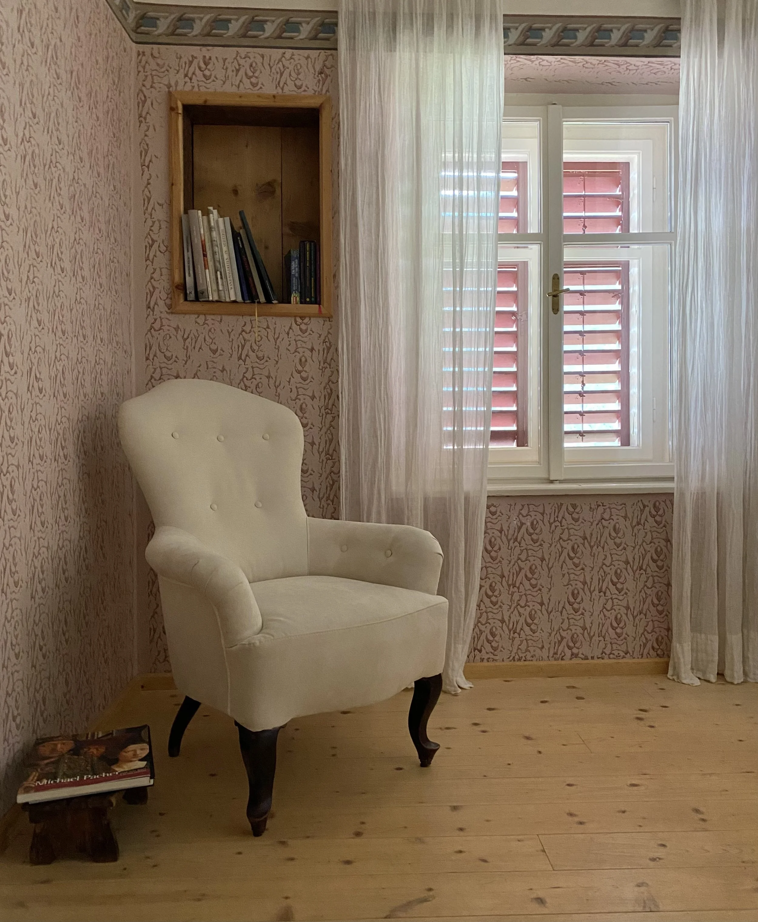 There is a total of 9 rooms at Zum Riesen and each one has it is own distinctive look and history to tell. We stayed in the First Room. An inviting room with a discreet pink tone, printed wall paper and wooden floor boards. The large pine wood bed is the dominating feature and a cute balcony opens up the room to the surrounding mountains and the apple orchards.